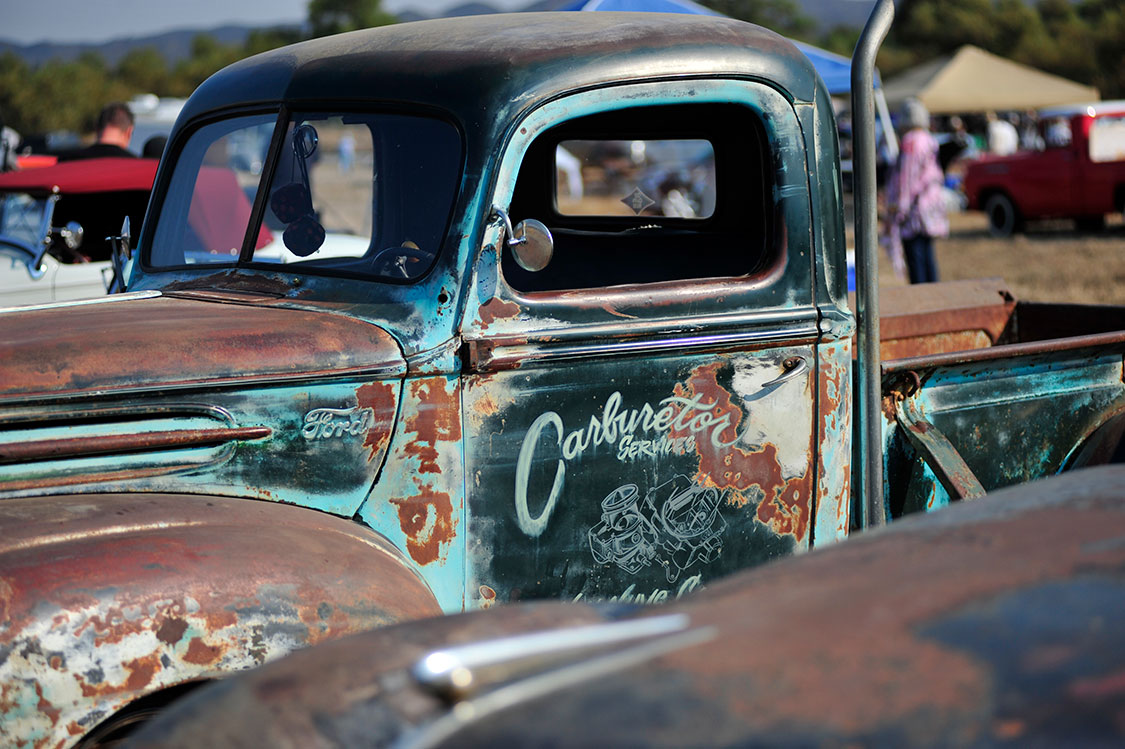 Once you get inside the gates there is a really cool car show of period-correct hot rods. Tons of patina and no billet parts were the order of the day here. One car had an interior made out of a few old pairs of denim jeans and another had its makeshift roof made from pieces of bamboo. Very creative people these old hot-rodders! There was also a pretty good size swap meet, and just like everything else here only had period-correct parts for sale. There were also a few food vendors that were reasonably priced.