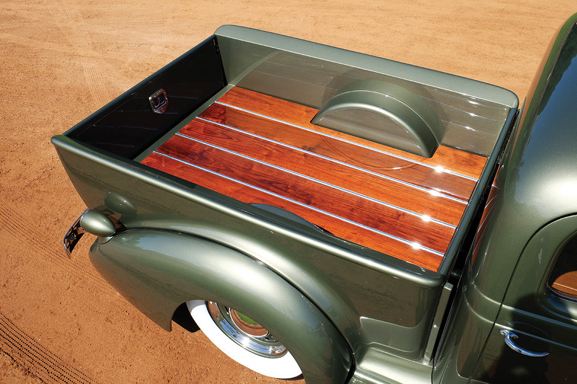 After the body was assembled, the truck was brought back to my home garage where I completed the air suspension installation, wiring, engine tuning, gauge panel installation, and custom wood bed. The bed was made out of walnut planks with an epoxy resin coating and final automotive clear.