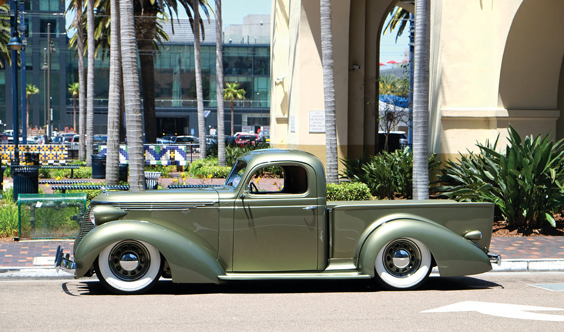 From there, the sandblasted body and frame were sent to Nick Battaglia from Loose Cannon Customs in Santee, CA. Nick and his crew performed some heavy-duty metal repair and custom fabrication including hidden hinges, a custom rear roll pan, enlarged rear window, smooth running boards, and a custom dashboard setup.