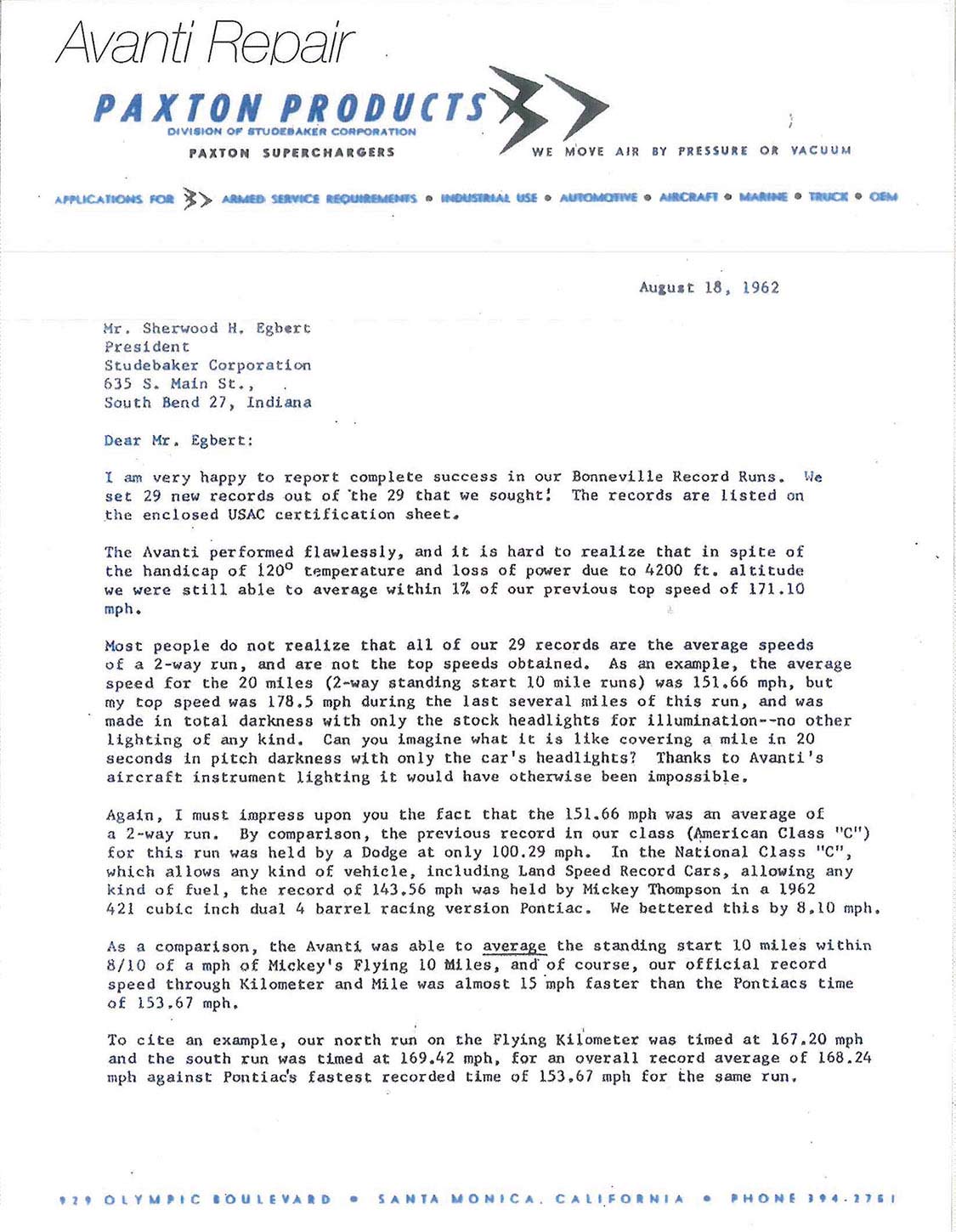 An Avanti equipped with a supercharged V-8 was one of the fastest 1960s automobiles. A supercharged model driven by legendary driver Andy Granatelli reached 168 mph, while a modified R3 version reached 196 mph – a staggering speed for a 1960s production street car. An unbelievable twenty-nine Bonneville speed records were eclipsed by a supercharged Avanti.