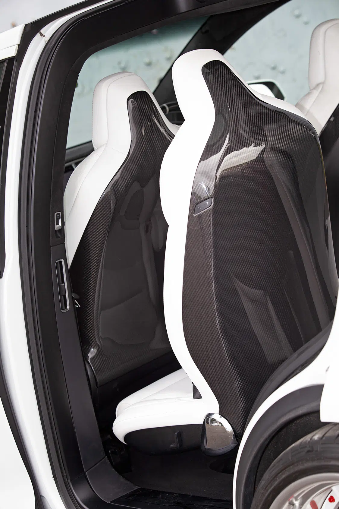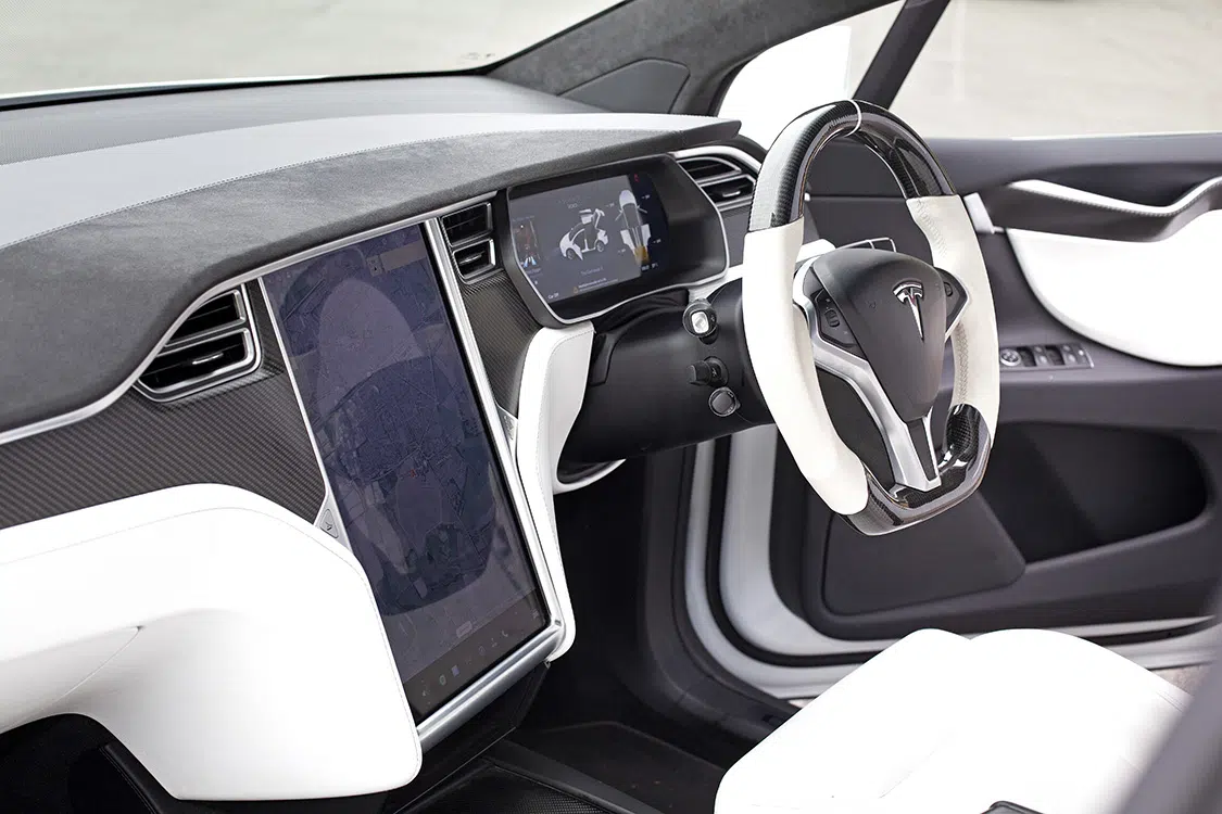 Andrew also treated the Tesla’s futuristic interior to a makeover. The interior refresh included the installation of five custom-made seatbacks in gloss carbon fiber. Also, the steering wheel was replaced with a flat-bottomed carbon-fiber and white variant, perfectly complementing the seven seats and carbon-fiber interior trim that adorns the cabin.
