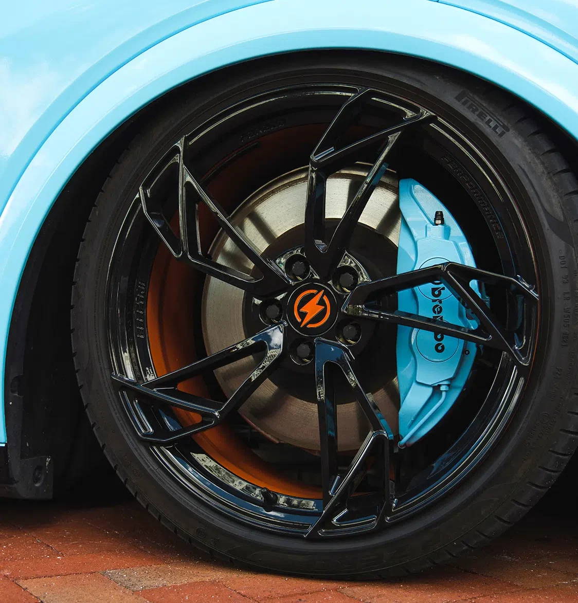 Jason also upgraded the wheels and tires. He went with Electric Performance 20×8.5-inch wheels wrapped in Pirelli P-Zero 255/40R20 tires. The wheels were a custom design, with a black finish on the face, an orange drum, and accents on the center caps to match the wrap.
