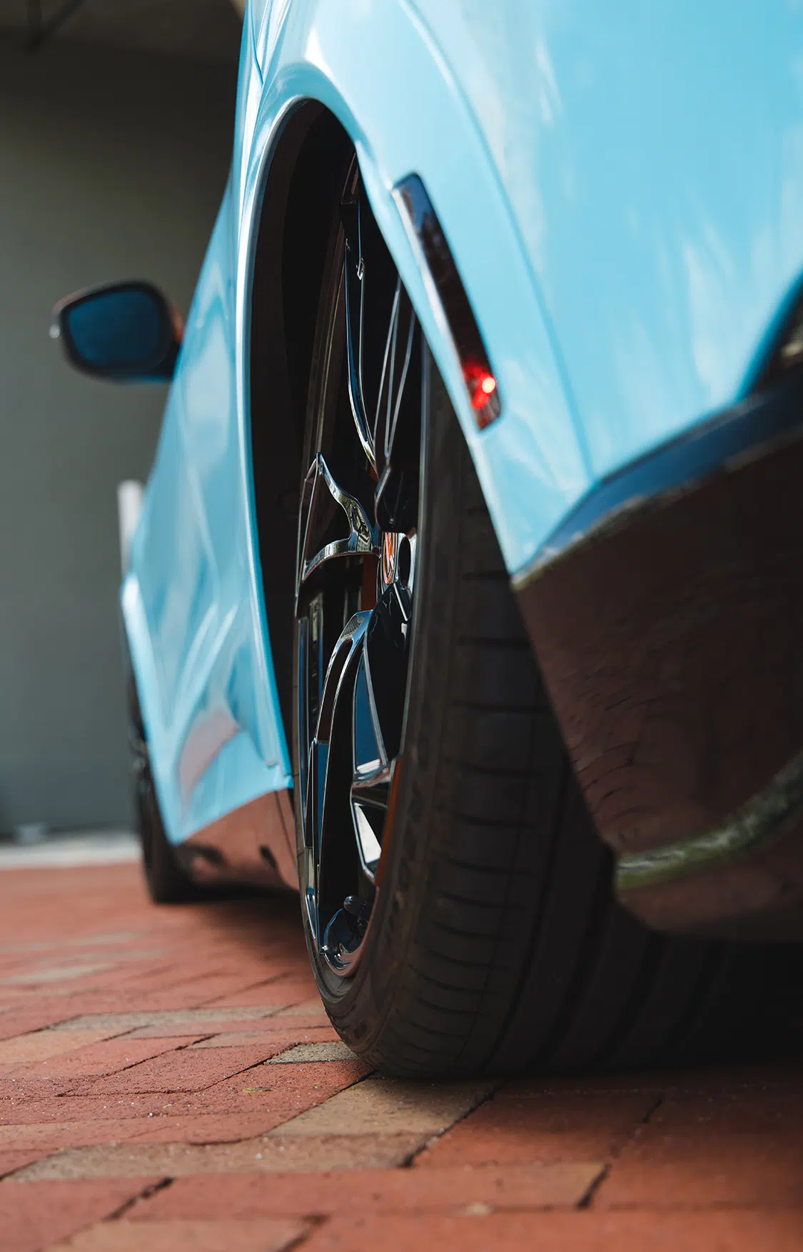 Jason worked with Signature Customs to apply the wrap and install body mods, including custom Maxton Design side skirts and a front lip. The wrap is two-tone light sky blue and burnt orange.