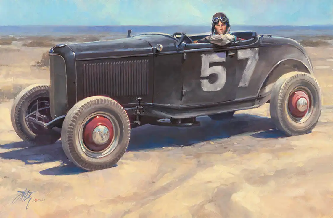 “Tom’s art is astonishing and thrusts you into a lost era of Automotive Culture like no one else. Reminiscent of the days of racing, slat flat excitement and the seeds of speed,” said Fireball, “His work will go down in history as ‘saving history.’”