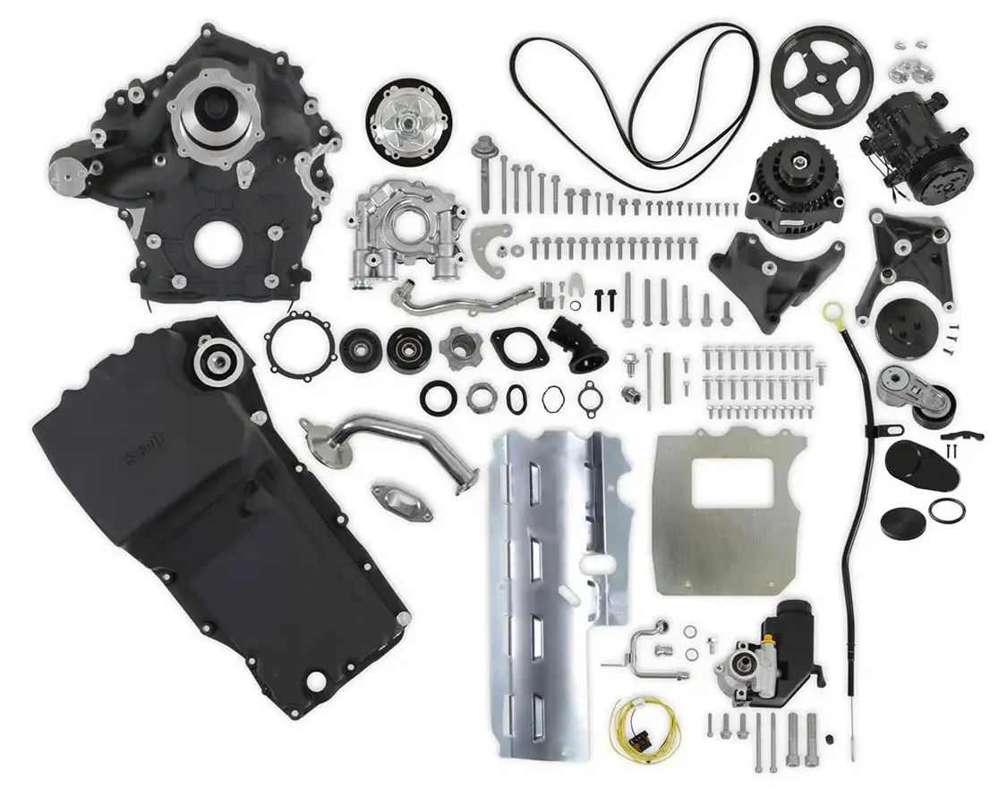 Upgrade your Ford 7.3L Godzilla engine with the Holley Godzilla high-mount accessory drive kit, complete with the Holley swap oil pan and pump for a sleek black finish. This comprehensive kit includes everything you need for a seamless installation: Holley timing cover/coolant manifold, SD7 A/C compressor, alternator, P/S pump, tensioner, water pump, belt & pulleys, oil pump, and oil pan. Elevate your engine’s performance and aesthetics with this all-in-one solution.