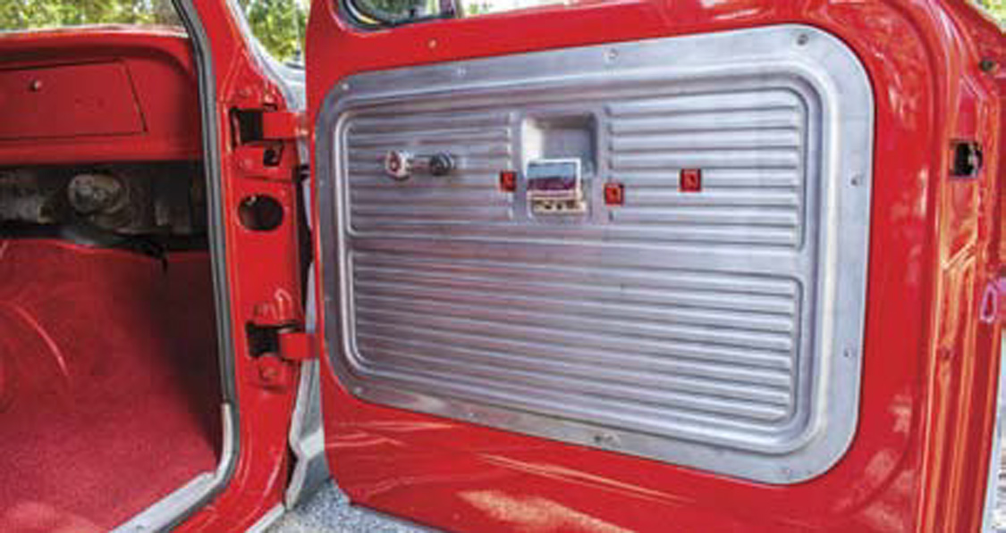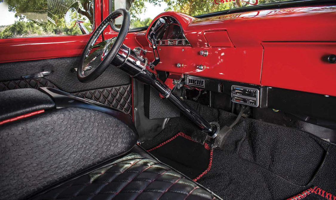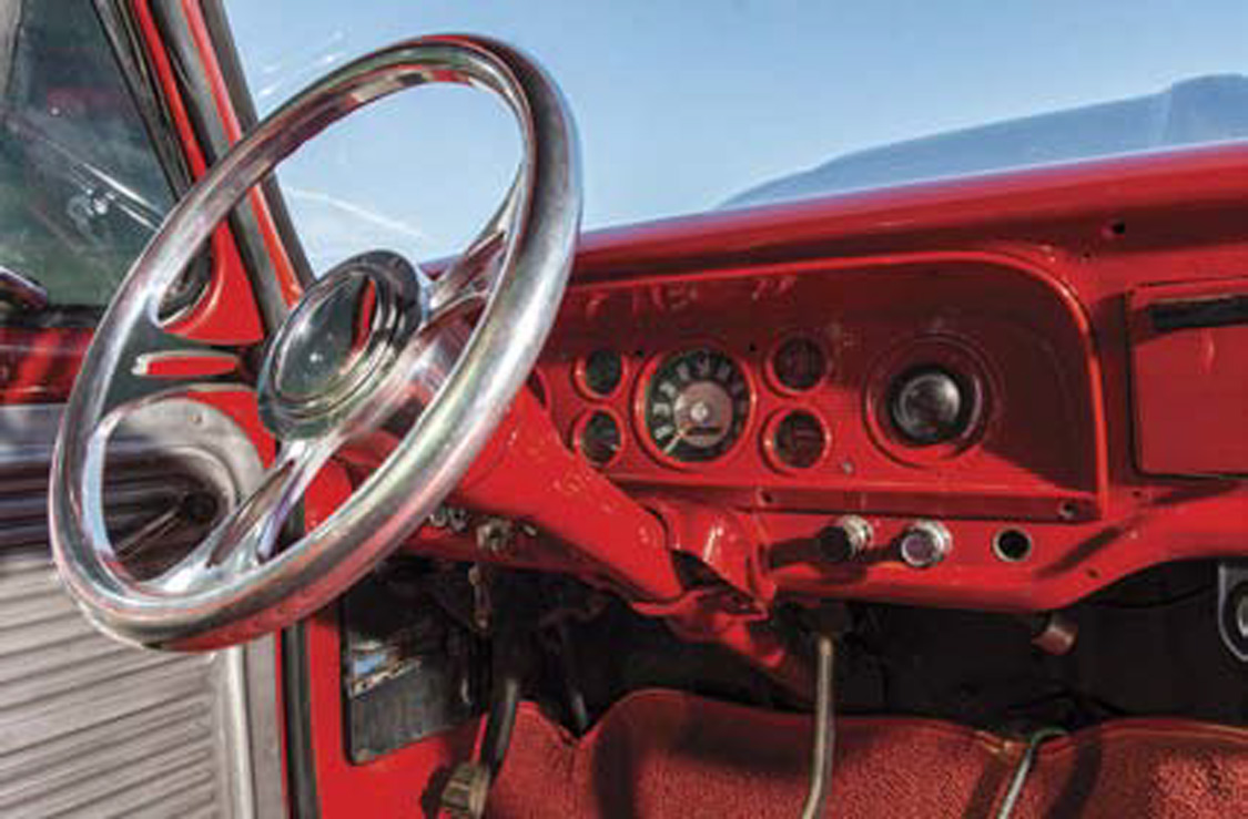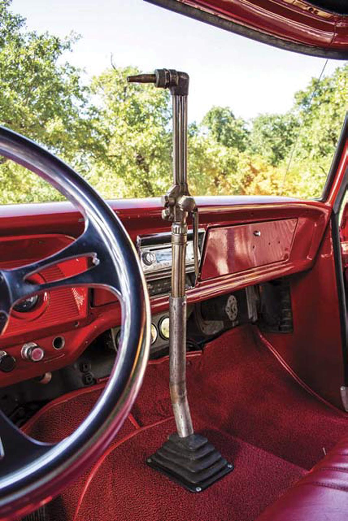 The original truck had a padded dash and a lot of wood grain, and quite frankly, Jeremy hated it. The interior now consists of the instrument panel and doors from a 2 ½ ton wheat truck and a bench seat that was gifted to him from a 1994 Chevy truck. M&R Upholstery in Altus, Oklahoma, recovered the seat in red vinyl. The custom shifter is actually an old antique torch that he picked up from his dad’s collection and is easily the attention piece of the Ford’s interior.