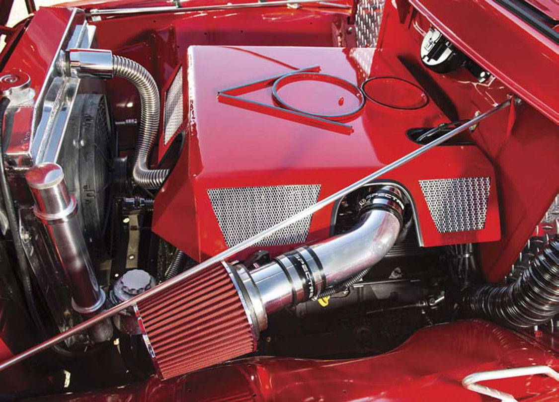 Without doubt, the most eye-catching feature of Addison’s Ford is the bright red paint. For this he turned to Justin Byrd at Byrdman Kustomz in Lawton, Oklahoma, for assistance. The original idea called for a two-tone paint scheme, but after a lot of second guessing, Addison kept it simple with Race Red. Justifi ed Details of Lawton, Oklahoma, then added ceramic coating that brought out the Race Red base to an entirely diff erent level.