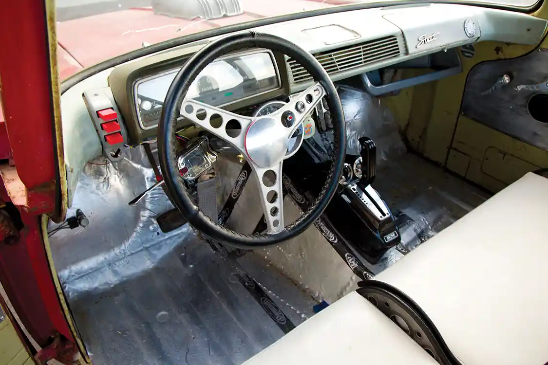 Underneath the Stout’s tabletop hood is a Chevy Vortec 350 making 425 hp and 465 ft-lbs of torque. The American motor makes use of a roller cam, lifter and rockers. The heads also are finished with a full port and polish. The Holley carb breathes through a custom hood scoop as the hole in the hood serves as the first visual cue that the truck has been properly hot-rodded. However, it’s far more likely that the Stout will be heard long before it’s seen. The beefy power plant exhales through Hooker headers and a custom dual exhaust ending in a pair of Dynamax mufflers. The power is sent through a TH350 trans equipped with a B&M shift kit to a Chevy rearend with a 3.43 gear ratio.