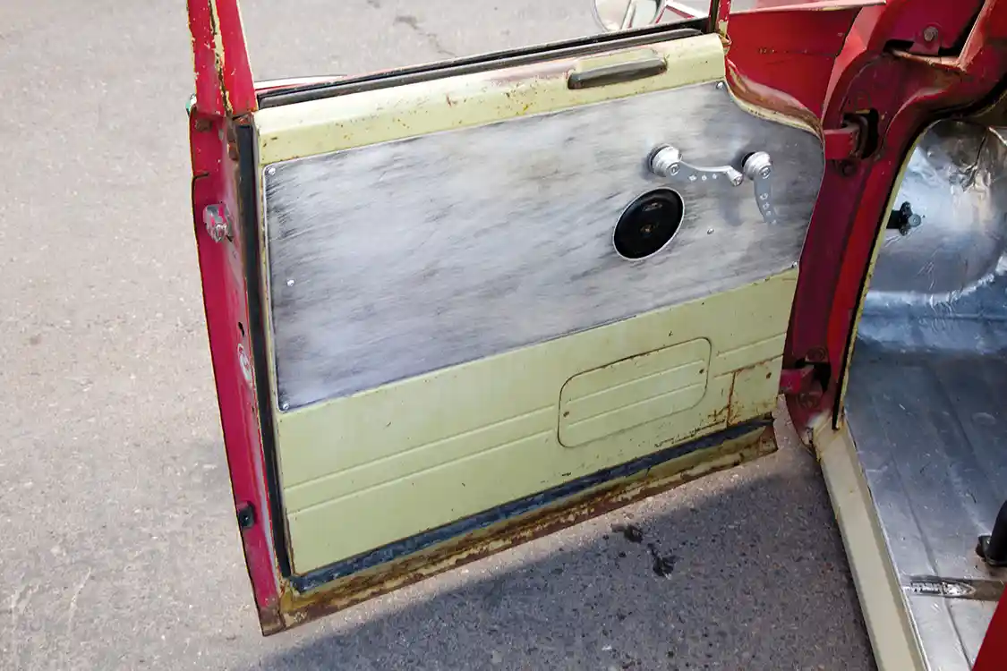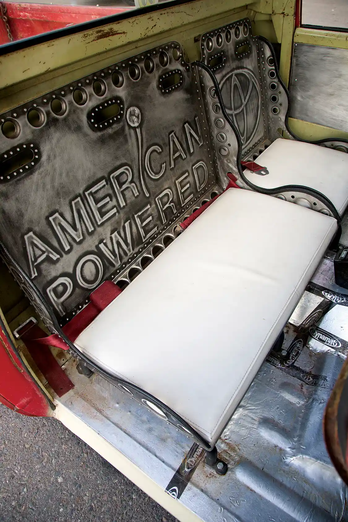 While the hybridization of the rare Toyota Stout, Chevy truck and muscle goodies is plenty unique, what truly sets Rob’s truck apart is its “rat-rod-esque” vibe. The style is complete with the truck’s original red patina. The simple top-chop of the inner fenders is a brash alternative to the usual tubs, and further cutting reveals in detail the rear suspension configuration. The interior features hand-made bomber-style seats with aluminum backing. The backs are embossed with the “American Powered” and Toyota icons. The seats are upholstered in custom vinyl for a comfortable cruise, and a single driver’s seat combined with the dual passenger bench is an added measure of customization for the interior. The door panels are armed with matching riveted aluminum, while the dash is equipped with a Squeegee’s Custom steering wheel, SoCal Gauges and custom 3D-printed switches for the air control.