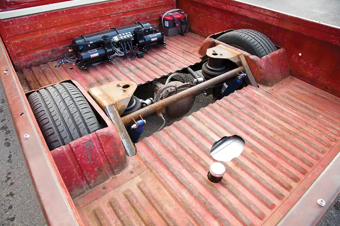 Beginning with the chassis of “Toyolet” (Toy-Oh-Lay), the frame has been shortened and the rear suspension converted to a triangulated 4-link. The front uses the factory control arms from a Chevy S-10, with drop spindles to minimize ground clearance. All four corners of Toyolet are suspended with Air Lift Dominator airbags. The ’bags are fed from a single 5-gallon tank mounted in the bed along with dual VIAIR compressors and an AccuAir EXO Mount setup in the bed.