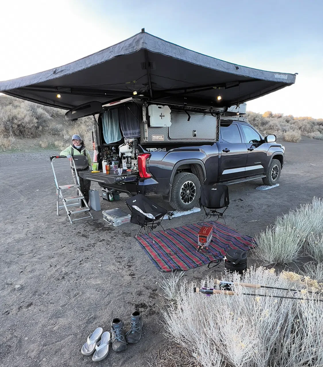 Addressing the camping part of the rig has been fun. I added a roof rack on the camper to hold our River Quiver fly rod carrier and a 100-watt solar panel, adding to the power supply and rod-carrying capacity. I also bolted on a 270-degree Major Shady awning from Yakima, and a shower stall from Joolca. Then, a diesel heater was added, making colder nights more comfortable. Like I said earlier, why not?