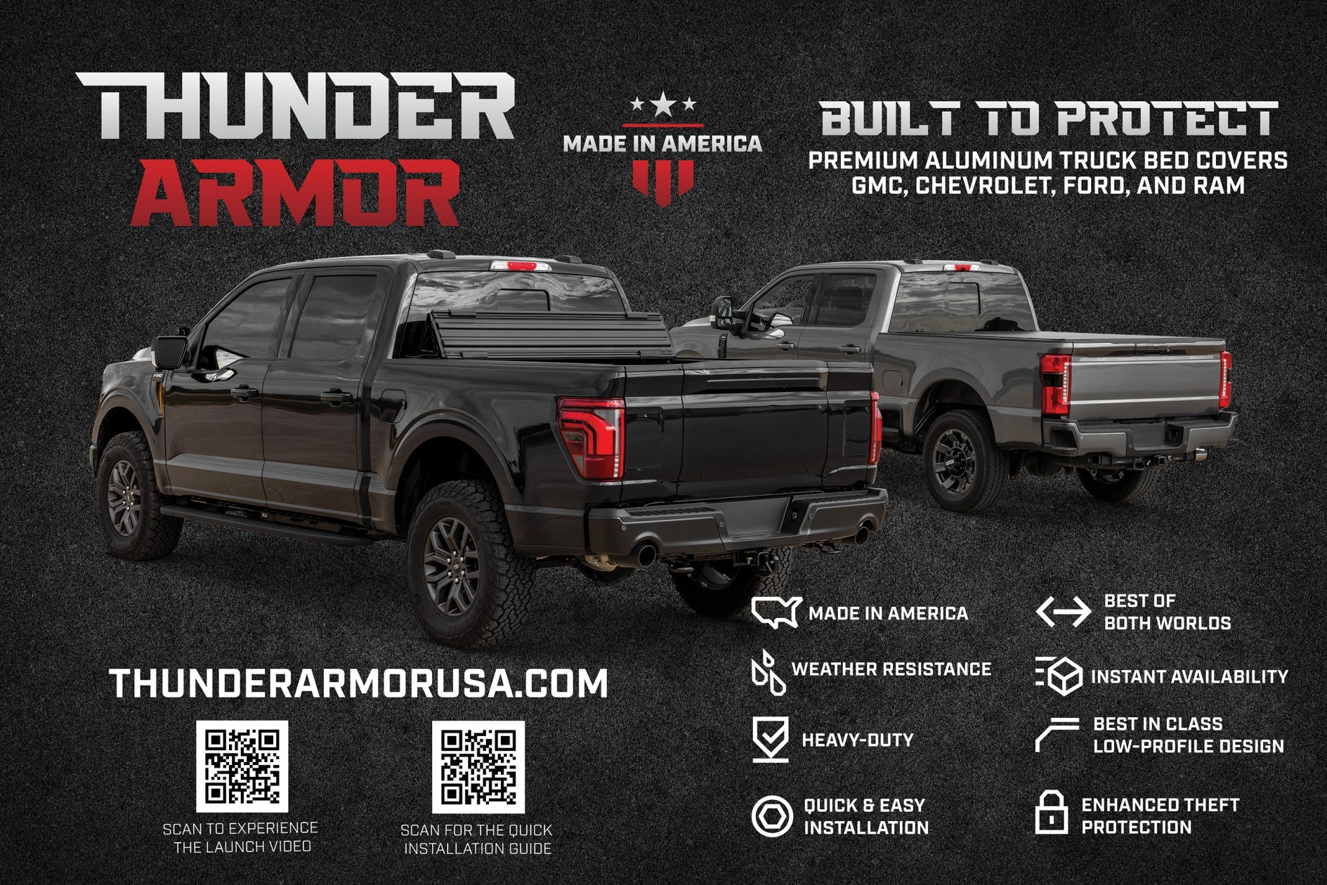 Upgrade your truck with the Thunder Armor Truck Bed Cover — built from premium-grade aluminum to deliver unmatched strength, security, and style. Proudly made in the USA, it features a best-in-class low-profile design that sits flush with your truck bed while providing superior weather resistance and enhanced theft protection. Designed for real-world use, it installs quickly with minimal tools so you can get back on the road faster. With in-stock availability and rugged durability, Thunder Armor is ready to protect whatever you haul — wherever you go.