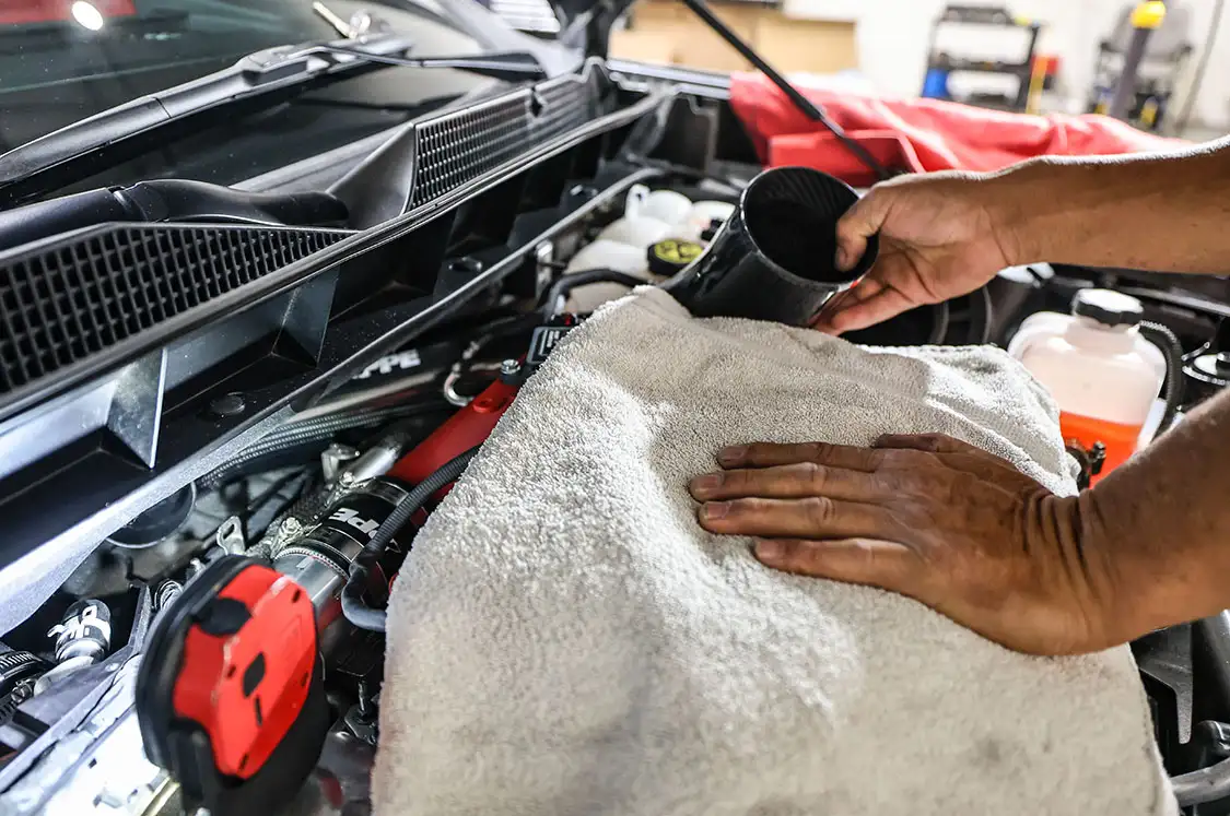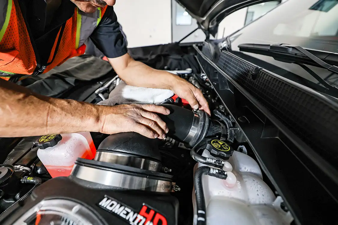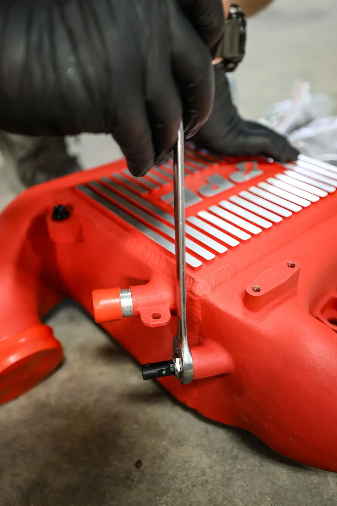 01. The factory engine bay layout has a plastic cover on the small OEM intercooler and a restrictive intake, but that’s about to change.02. The clamps that hold the factory air box lid and tube were loosened and removed.03. The front engine cover was then removed and set aside with all the clips.04. Next, we removed the driver side corner support. This needs to come out to allow clearance for the lower air box to be removed.05. The wiring harness from the side of the lower factory air box assembly was then unclipped from the truck.06. The rubber boots from the factory air box were taken off and installed on the new AFE airbox. These are needed to secure the new air box to the truck.07. The MAF sensor from the factory intake tube was swapped to the new AFE intake tube ensuring it’s in the right direction.08. The new air box was installed into the factory holes the stock box came out of.09. The new air filter was slid into the box.10. The new intake tube was installed and secured to the factory tube and the air box with supplied hardware. The corner brace and front engine cover were reinstalled at this point and the wire harness was secured to the side of the new air box.11. Next up was the PPE air-to-water intercooler. The required hardware as well as a new base bracket come included.12. Next, we removed the factory intercooler cover as well as the NOx sensor and set it aside.13. We then disconnected both inlets into the factory intercooler.14. The hoses were then clamped before removal to keep the coolant spilling to a minimum.15. The entire stock intercooler was removed as one unit.16. As you can see, PPE did a full casting of the new base bracket, so the new intercooler fits as good as the factory one did. A couple of the studs need to be moved over to the new PPE bracket.17. The factory temperature sensors needed to be moved to the PPE intercooler.18. The new PPE base bracket was then installed with factory hardware.19. The new intercooler was installed and all lines were connected with supplied hardware.20. The NOx sensor was reinstalled to the new intercooler with supplied bracket and hardware.21. The overflow tank was filled with the appropriate coolant, the tank was lifted and the bleeder valve was loosened. We kept filling the tank until the coolant flowed out of the bleeder hole.22. Once the air was purged from the intercooler, the bleeder screw was tightened.23. With all of the electrical connections and coolant hoses installed, the new intercooler was good to go.24. The Zilla carbon fiber intake tube wasn’t available when the intake and intercooler were installed, so we had to go back and add it after the fact. If you are installing all these parts at the same time, it will make the process easier, but it’s still not hard adding it later like we did. You can see how much more unrestrictive the new carbon tube is compared to the massive factory tube.25. After removing the two mounting connectors from the factory tube, as well as the AFE intake tube installed in step 10, it was removed with a little finesse. Once removed, we slid the new PPE tube into place where the factory tube was.26. With the new tube in place, we tightened all the supplied hardware to secure it in place. The carbon fiber looks right at home tucked against the firewall too.27. We then reinstalled the AFE intake tube that now goes from the new PPE carbon tube to the air box.28. The AFE 3-inch exhaust completely replaces the factory exhaust with minimal connections and mandrel bends.29. We cut the factory exhaust 3.75 inches behind the rear weld on the exhaust valve, which is just before the factory exhaust hanger.30. We also cut the factory exhaust before the rear axle. This wasn’t required but made the removal of the factory exhaust easier.31. We started with the front connection then moved to the rear, and aligned and tightened the new piping with supplied clamps.32. The new dual black tips I chose for this truck look much better than the factory cut tip ever did. Once everything was tight, we went back through and ensured there were no leaks and adjusted the clamps as needed to eliminate the leaks.