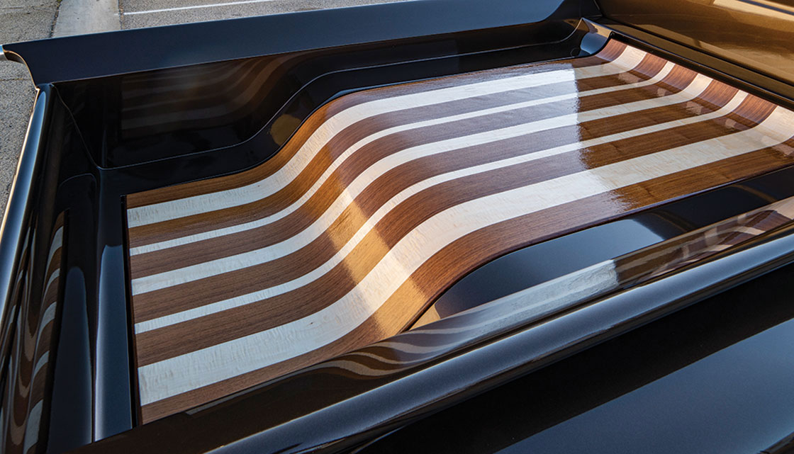 - Custom, handcrafted black walnut and curly maple center console and matching door panels