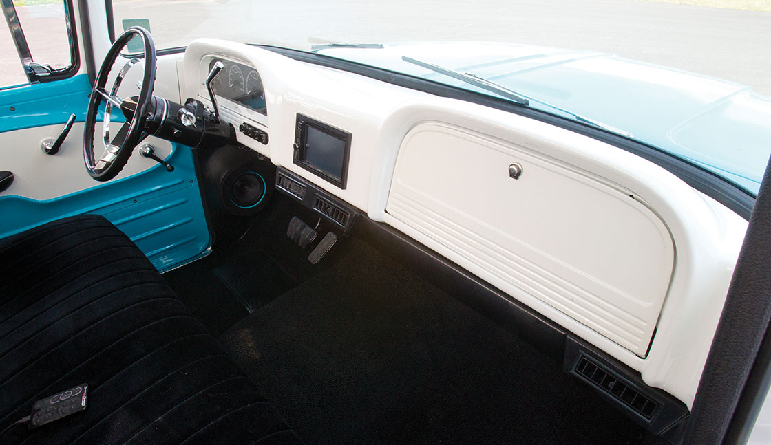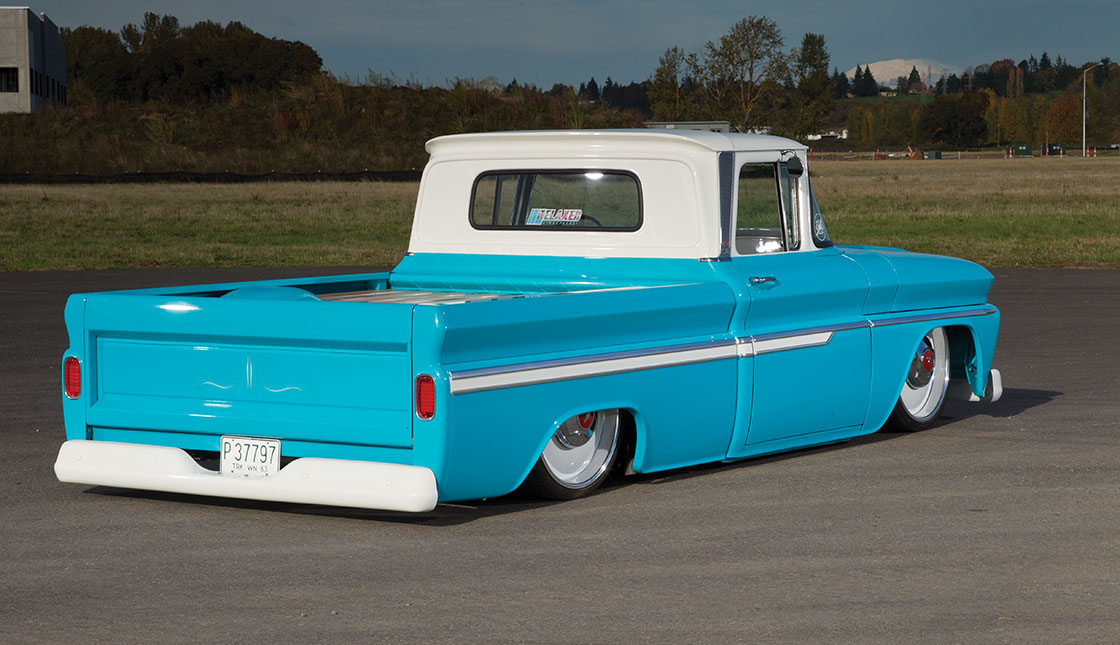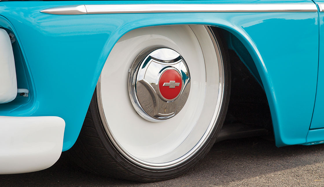 - 22x10 Intro Smoothie billet wheels, centers painted white with 1964-66 C-10 hubcaps