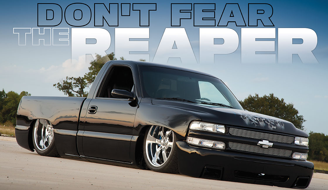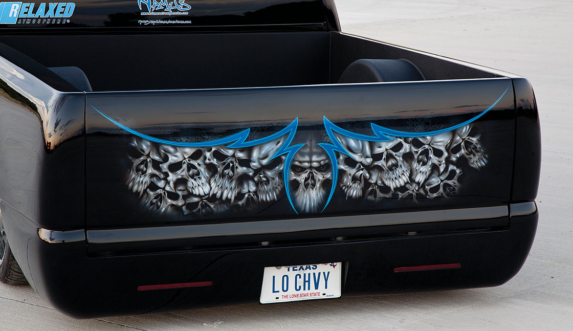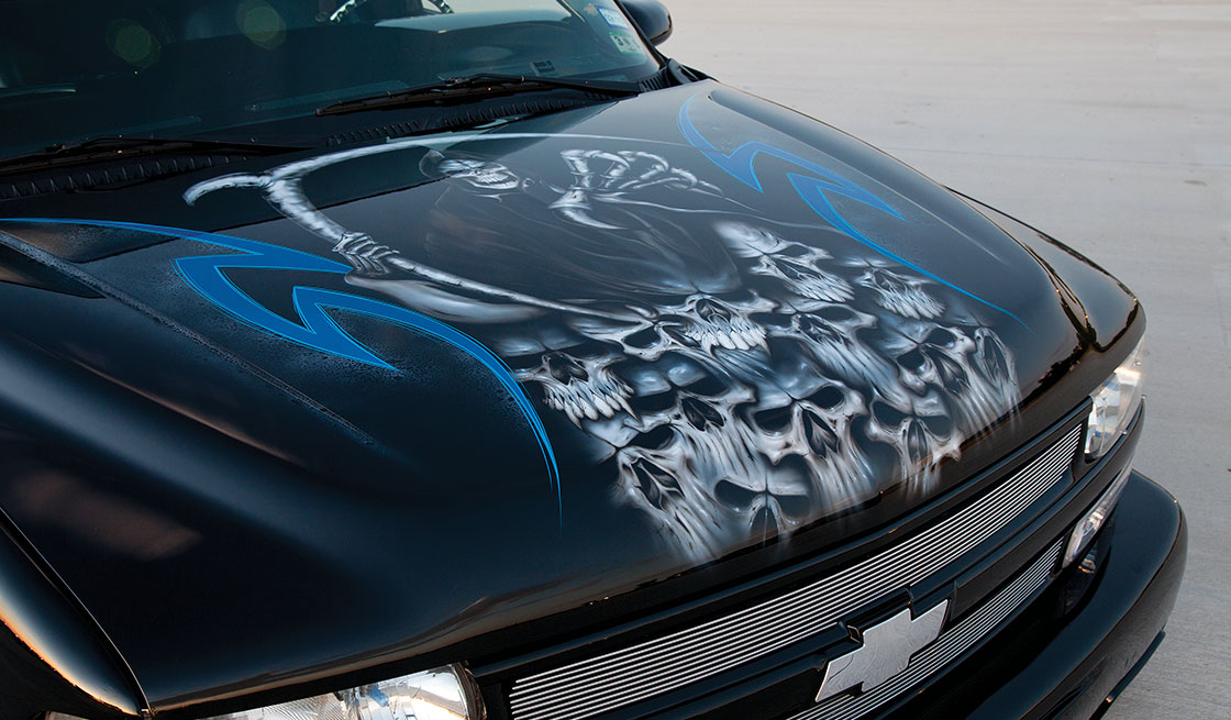 - Custom airbrushed skulls and grim reaper with Vivid Blue Pearl graphics