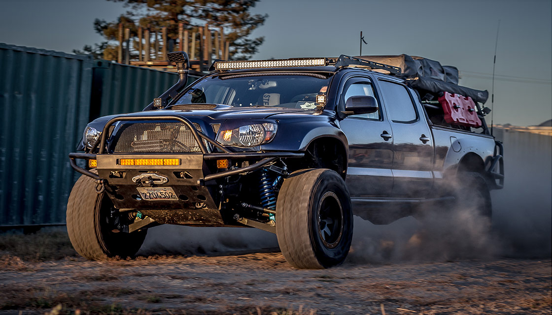 front: king racing 8 x 2.5 Coilovers w/remote res,  dirt designs 4wd race long   travel kit,  wheelers super bump-stops, total Chaos shock tower gussets, total Chaos alignment tab gussests, total Chaos 3.5" Chromoly axles, rear: dmz sua long travel kit,  infamous metal works bed Cage, boxed frame w/new   Cross-members, deaver lt springs + aal, king racing 16" 2.5 triple bypass shocks w/ remote resin's, bay area metal fab ( b.a.m.f. ) outer frame gussets, fox 2.0 air bumps 2" travel, poly-performance air bump mounts, 18" limit straps, king 8" Coilovers w/ 700# spring, hankook dynapro m/t 35x12.5x17 (x 5), scs sr8 m atte/gloss black [17 x 8 / 0 offset/4.5 bs] (x 5), spiderTrax 1.25 wheel spacers rear.