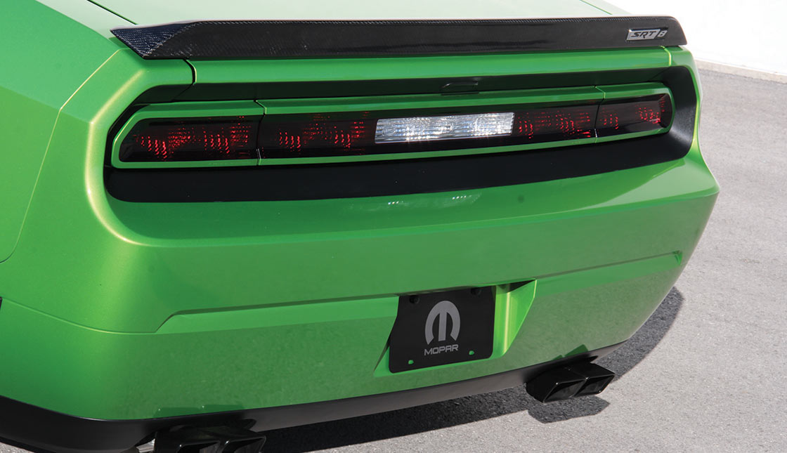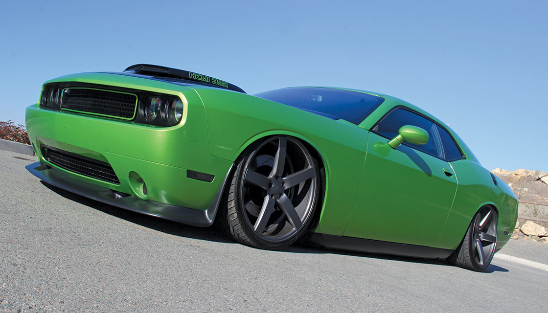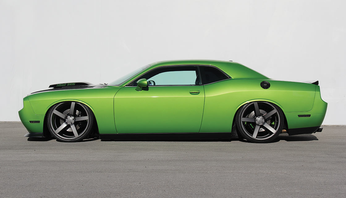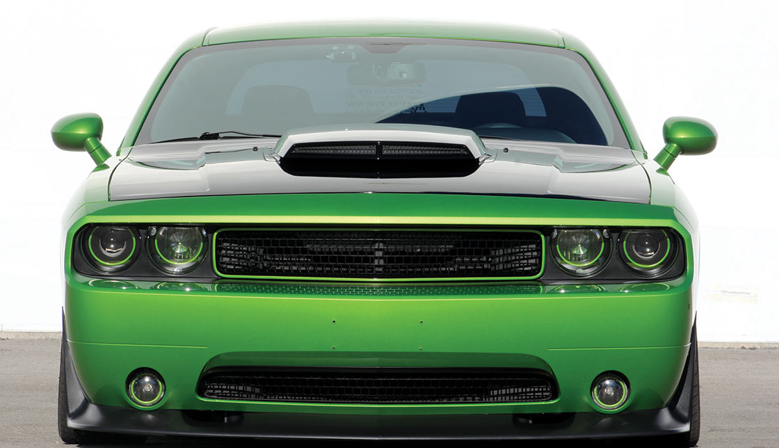- Dodge Green With Envy, Mopar T/A hood, Mopar black chrome grille, stock black-painted headlights with Oracle Plasma Halos, stock front air dam, stock tail-lights tinted with body color, stock rear spoiler, under-hood engine bay painted by Show & Performance, half covers by Chuck Parker, Oceanside, CA