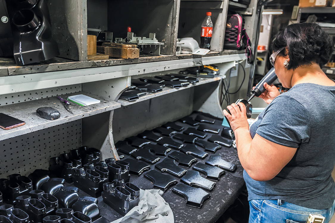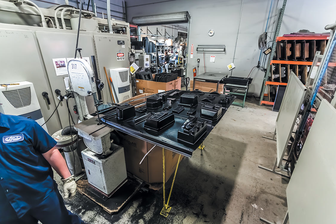 To start production, a worker grabs a sheet of ABS plastic and brings it to the molds.Many pieces can be made using one sheet of ABS plastic. With the pre-engineered mold prepped, the ABS can be added and heated.After the ABS is cooled, it can be removed from the mold and set on a table for trimming.