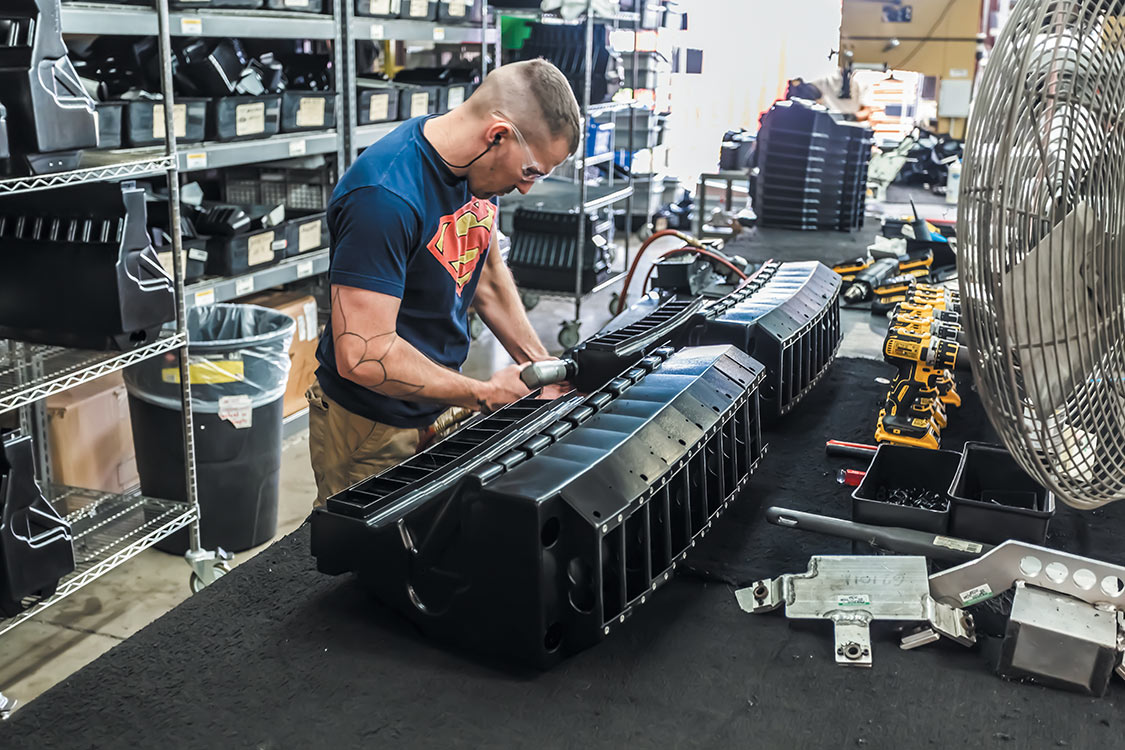 As one worker begins the assembly process, another starts cutting metal for the brackets and mounting plates.