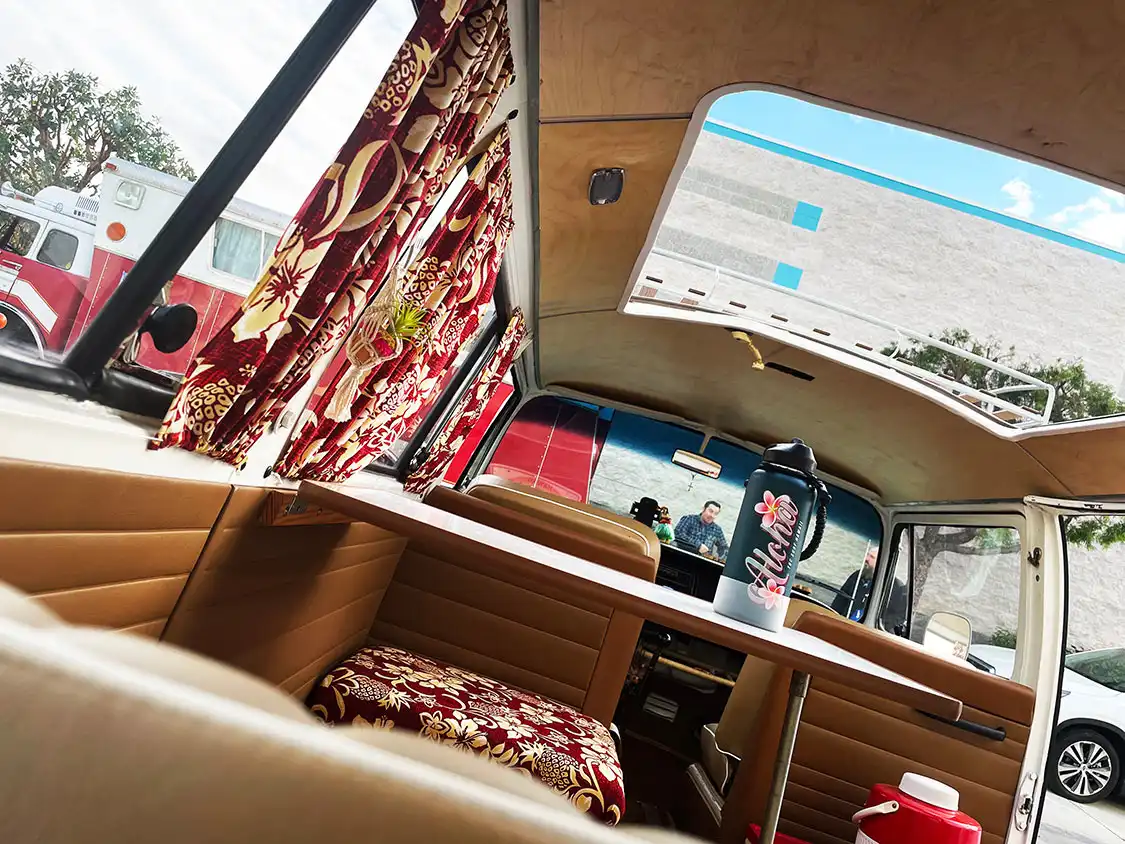 The restore took 2 years, lots of metal work, and paint. Personalizing the bus was so much fun. We chose a Hawaiian theme with bamboo floors because of our love of Maui, Aloha, and Ohana (family).