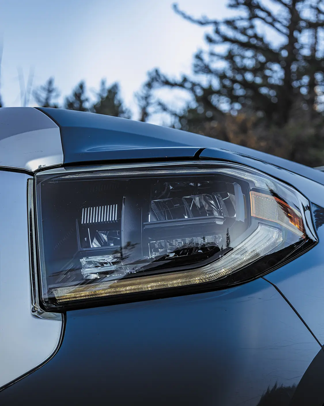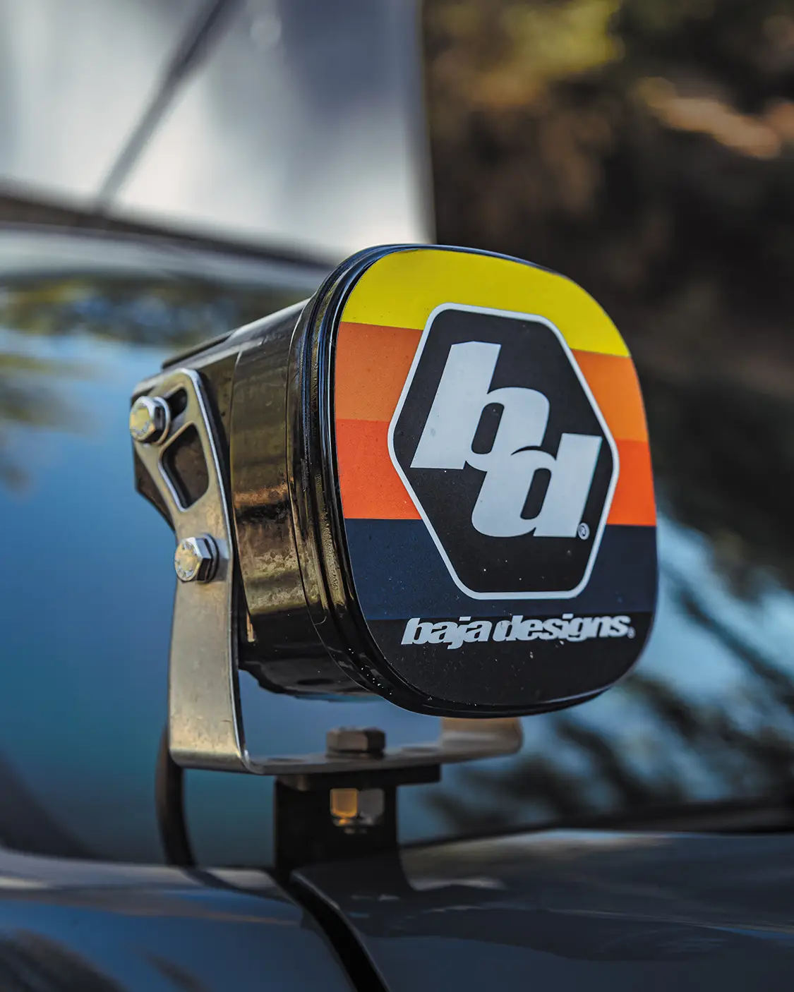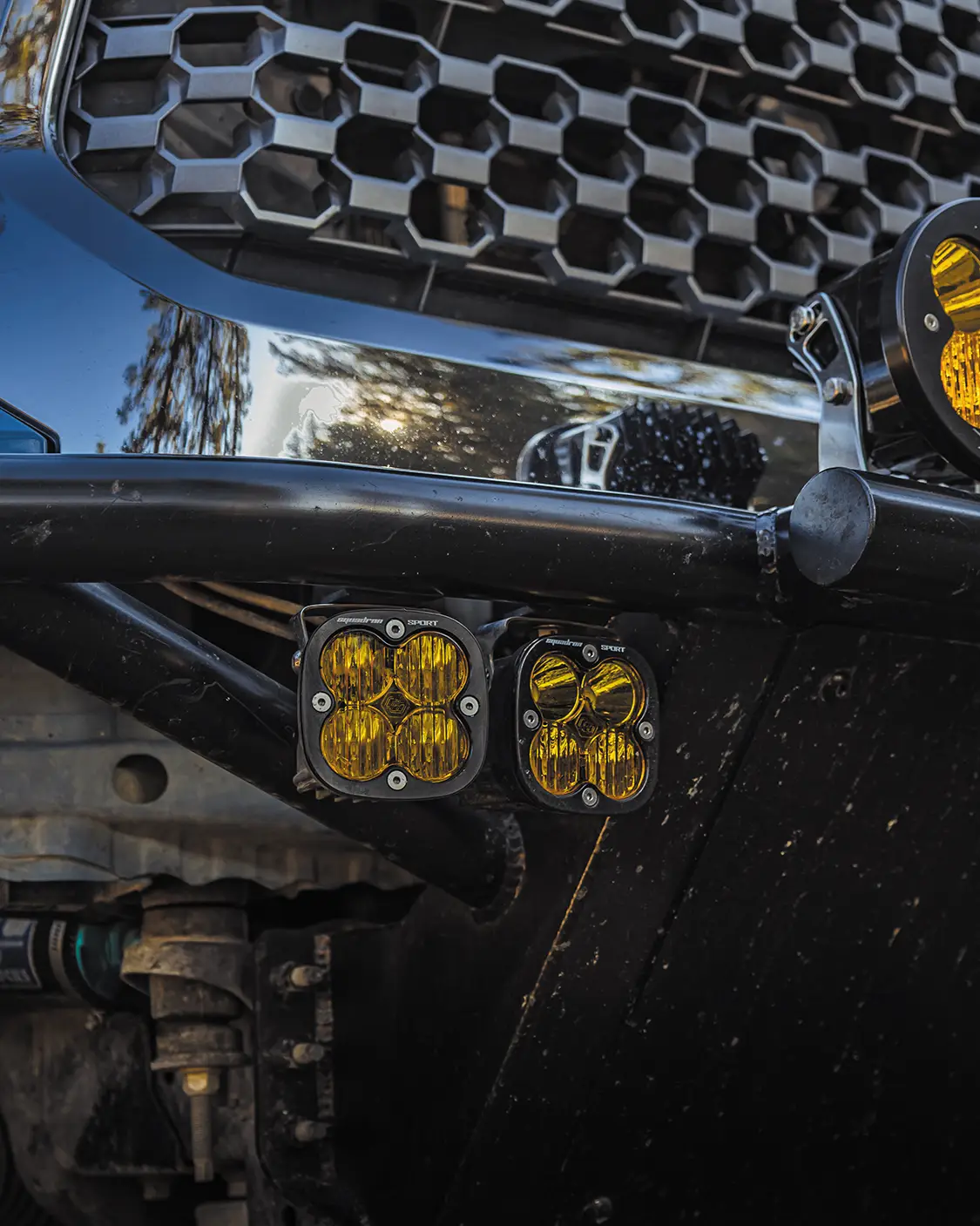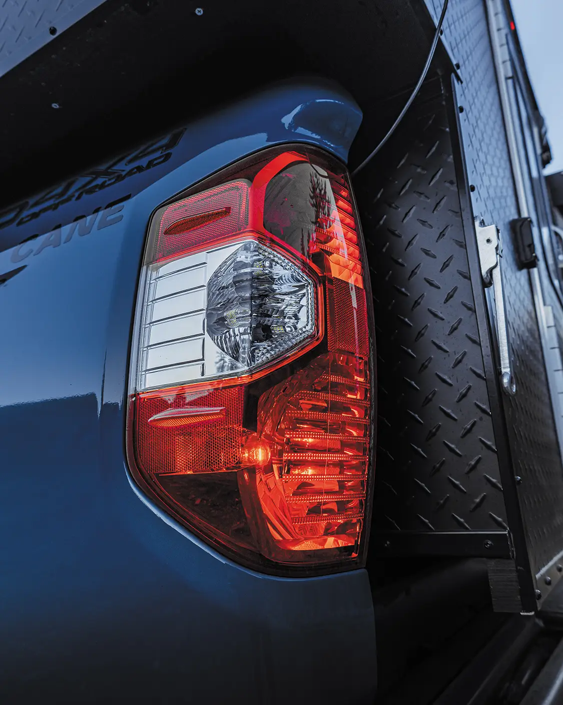 Starting off, this rig is rocking a set of SNF Motorsports bumpers. The Tundra also features 10 Baja Designs ditch and bumper-mounted lights all around, which is a combination of Squadron Sports and XL-R Sports, as well as custom Baja Design covers that give this colorway a real pop along the front end. The Cavalry Blue on this Tundra has always been a favorite of mine when it comes to factory Toyota color options.
