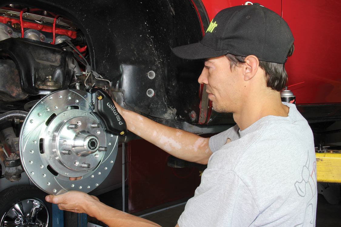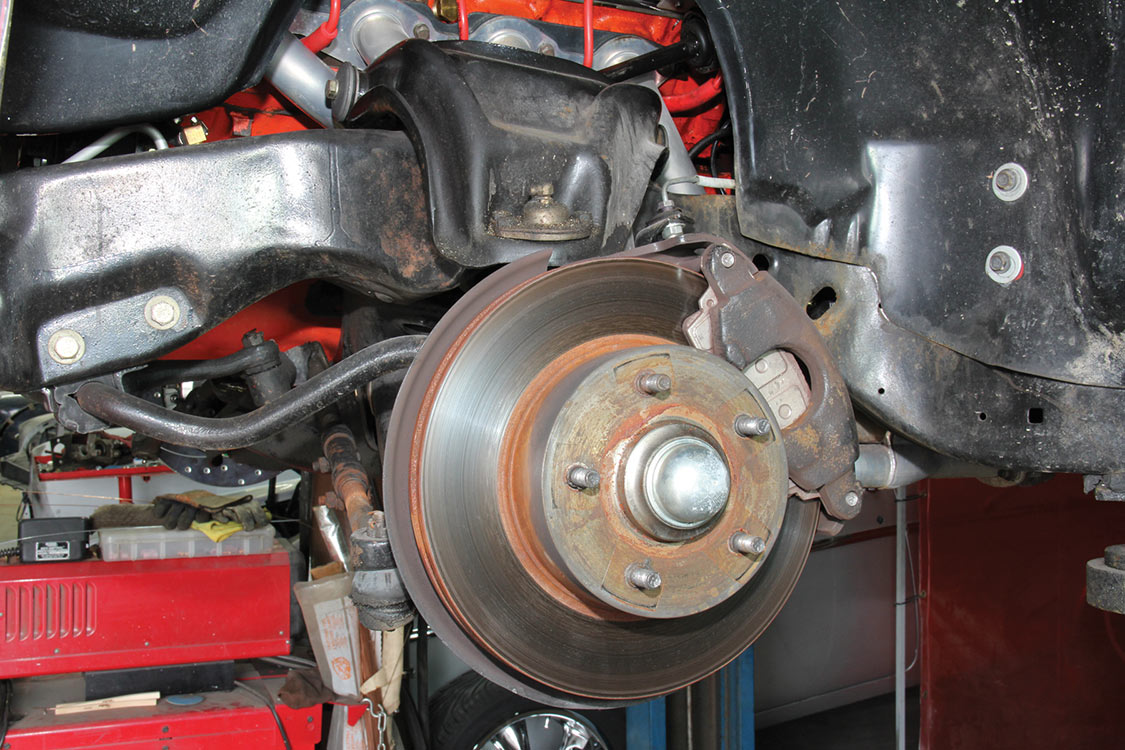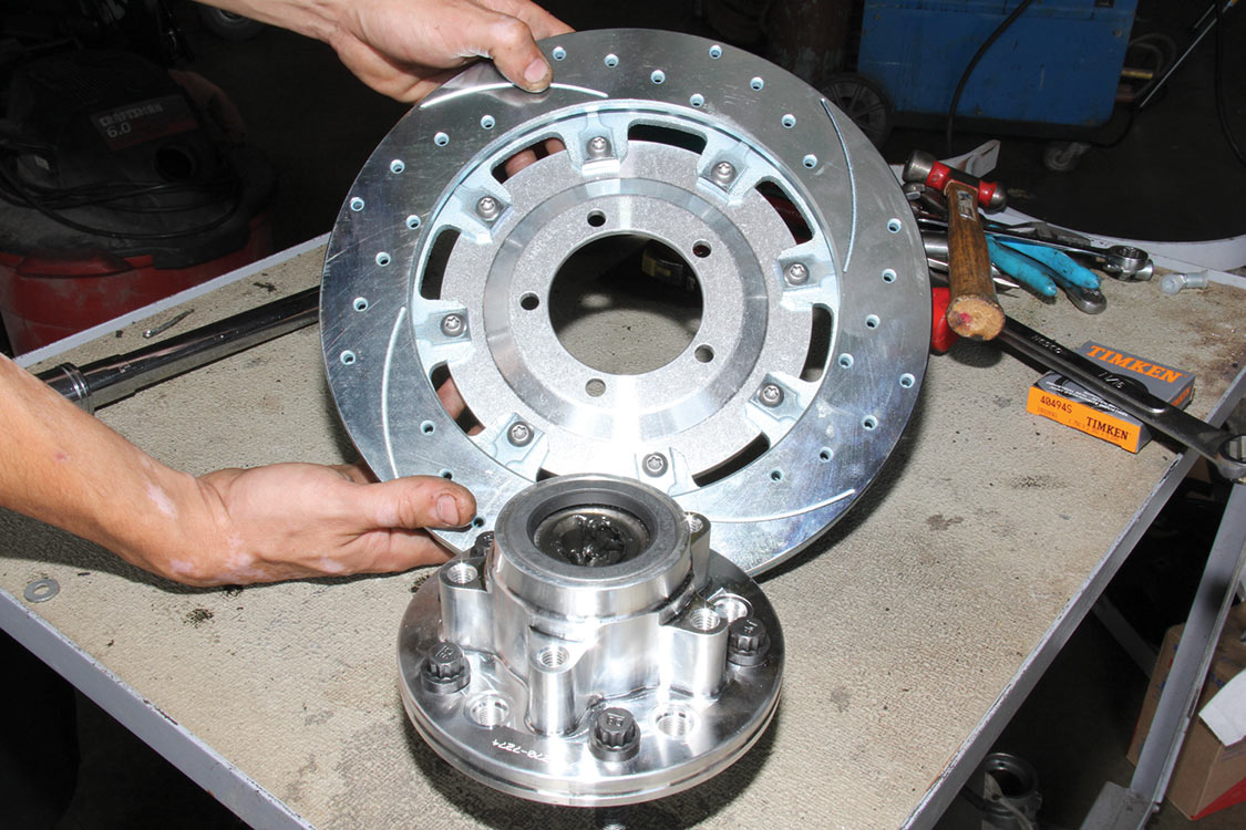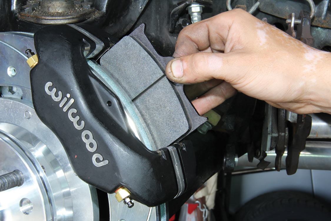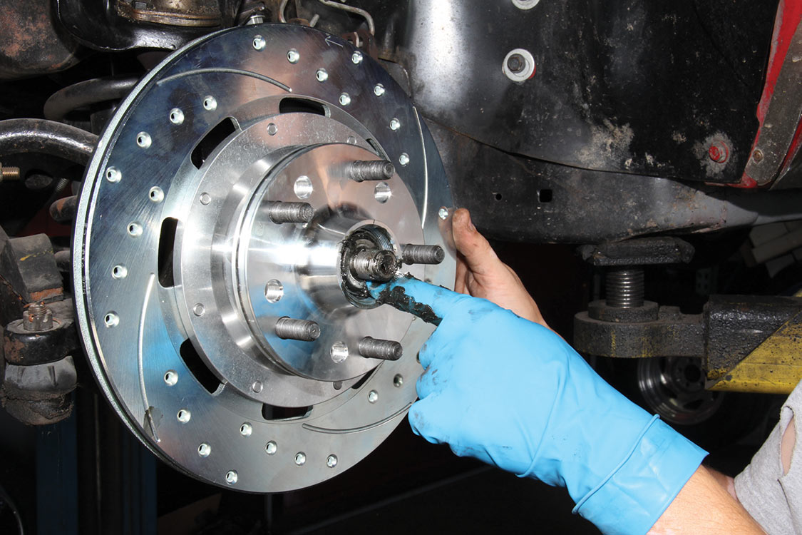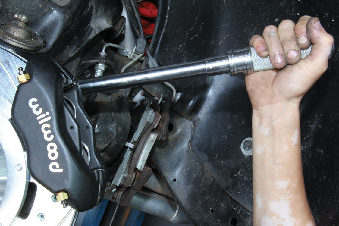 The factory front tie rod/steering arm was unbolted from the spindle/steering knuckle in preparation for the new Wilwood brake components.After mounting the Wilwood front brake caliper, the mounting bracket was torqued to 140 ft-lbs.The front tie rod/steering arm was remounted and torqued to spec.Packing the inner and outer hub bearings with grease is always a messy job. The Wilwood brake kit came with Timken (40494S) hub/rotor inner and outer cone bearings. Edgar applied Loctite Red thread locker to each of the five 12-point head wheel studs and threaded them into the proper 4.75-lug pattern of the hub. Next, he torqued them to 77 ft-lbs.After applying Loctite Blue thread locker to the bolt threads, Edgar inserted and threaded them into the adapter rotor or hat and torqued them using an alternating sequence to 25 ft-lbs to mount them to the rotor.Here is the Wilwood adapter rotor hat secured to the 12.19-inch diameter iron cross-drilled and ball-milled rotor. The hub assembly is shown in the foreground.The hub assembly was secured to the adapter rotor hat using Loctite Blue thread locker on Torx head bolts. An alternating torque sequence was used as the Torx head bolts to 55 ft-lbs.The Wilwood brake rotor, adapter rotor hat and hub were aligned and slid over the factory spindle. The outer Timken hub/rotor outer cone bearings were centered on the spindle.After the spindle washer was slid onto the spindle, the castle nut was threaded snugly onto the spindle threads. Edgar rotated the rotor assembly to acquire the proper rotational load/drag, eliminating any lateral play. Then he aligned the castle nut and inserted the safety cotter pin into the spindle hole and castle nut before bending it over the spindle. The Wilwood dust cap with O-ring was aligned and fit to the hub/rotor assembly.Supplied alignment shims were used to center the brake rotor to the brake caliper. The same amount of alignment shims (two) were used on the top and bottom. This contributes to even brake pad wear.After the Wilwood four-piston caliper and rotor were aligned and centered, the caliper mounting bolts were torqued to 40 ft-lbs.The Wilwood (BP-10) semi-metallic brake pads were inserted between the caliper pistons and rotor.The Wilwood brake pads’ safety cotter pin was inserted into the caliper brake pads to secure the holes.All Wilwood cross-drilled, ball-milled rotors have a stamped direction arrow to ensure the rotors are installed on the correct side of the vehicle. The arrow must be pointing in the forward rotation of the wheel/tire. The driver’s side should be rotating counter-clockwise, while the passenger side should rotate clockwise.The rotor was spun one more time to make sure there was proper clearance and rotation load.While installing the Wilwood brakes we decided to also install new stainless steel braided brake lines. This will eliminate any brake line swelling, chaffing or cracking.