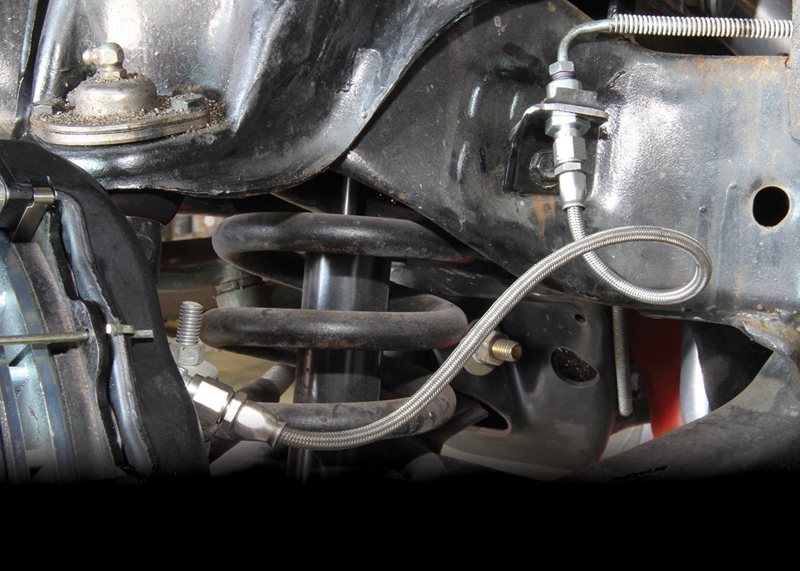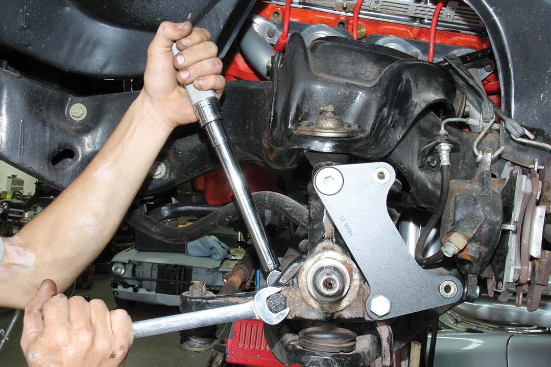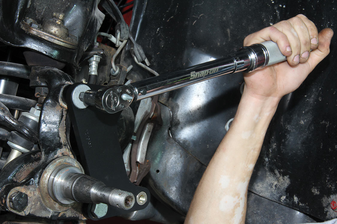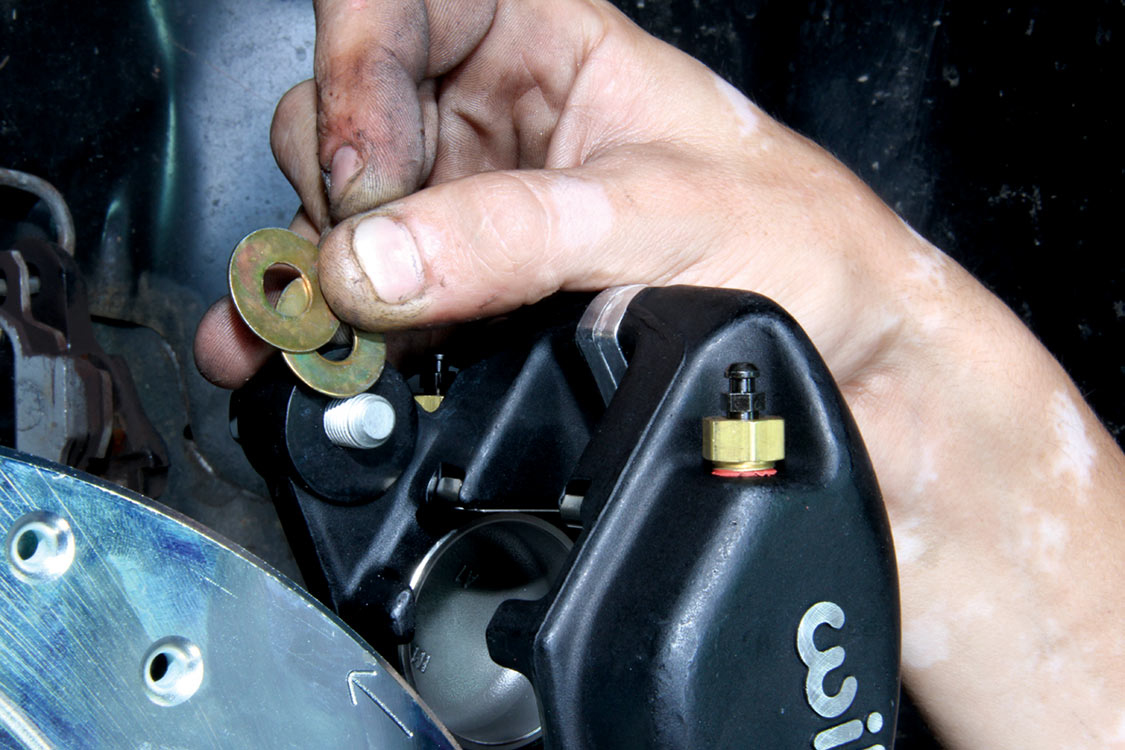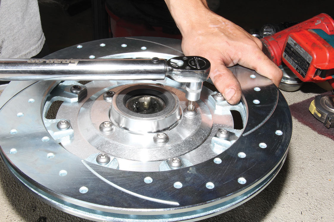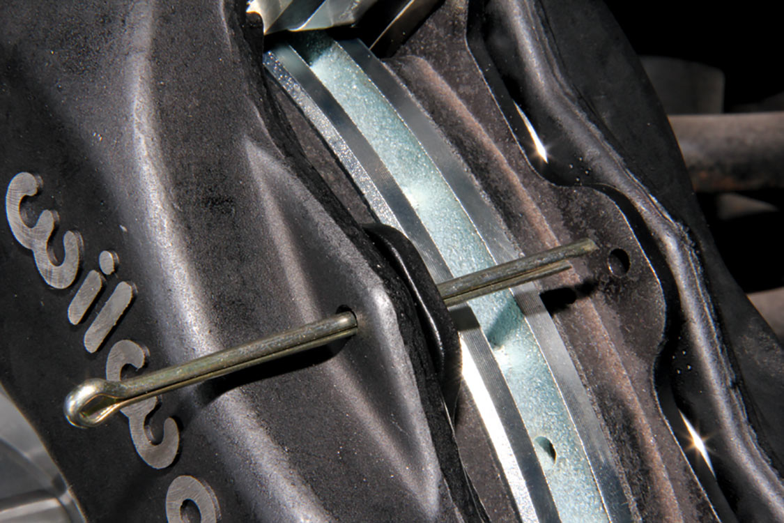 The factory front tie rod/steering arm was unbolted from the spindle/steering knuckle in preparation for the new Wilwood brake components.After mounting the Wilwood front brake caliper, the mounting bracket was torqued to 140 ft-lbs.The front tie rod/steering arm was remounted and torqued to spec.Packing the inner and outer hub bearings with grease is always a messy job. The Wilwood brake kit came with Timken (40494S) hub/rotor inner and outer cone bearings. Edgar applied Loctite Red thread locker to each of the five 12-point head wheel studs and threaded them into the proper 4.75-lug pattern of the hub. Next, he torqued them to 77 ft-lbs.After applying Loctite Blue thread locker to the bolt threads, Edgar inserted and threaded them into the adapter rotor or hat and torqued them using an alternating sequence to 25 ft-lbs to mount them to the rotor.Here is the Wilwood adapter rotor hat secured to the 12.19-inch diameter iron cross-drilled and ball-milled rotor. The hub assembly is shown in the foreground.The hub assembly was secured to the adapter rotor hat using Loctite Blue thread locker on Torx head bolts. An alternating torque sequence was used as the Torx head bolts to 55 ft-lbs.The Wilwood brake rotor, adapter rotor hat and hub were aligned and slid over the factory spindle. The outer Timken hub/rotor outer cone bearings were centered on the spindle.After the spindle washer was slid onto the spindle, the castle nut was threaded snugly onto the spindle threads. Edgar rotated the rotor assembly to acquire the proper rotational load/drag, eliminating any lateral play. Then he aligned the castle nut and inserted the safety cotter pin into the spindle hole and castle nut before bending it over the spindle. The Wilwood dust cap with O-ring was aligned and fit to the hub/rotor assembly.Supplied alignment shims were used to center the brake rotor to the brake caliper. The same amount of alignment shims (two) were used on the top and bottom. This contributes to even brake pad wear.After the Wilwood four-piston caliper and rotor were aligned and centered, the caliper mounting bolts were torqued to 40 ft-lbs.The Wilwood (BP-10) semi-metallic brake pads were inserted between the caliper pistons and rotor.The Wilwood brake pads’ safety cotter pin was inserted into the caliper brake pads to secure the holes.All Wilwood cross-drilled, ball-milled rotors have a stamped direction arrow to ensure the rotors are installed on the correct side of the vehicle. The arrow must be pointing in the forward rotation of the wheel/tire. The driver’s side should be rotating counter-clockwise, while the passenger side should rotate clockwise.The rotor was spun one more time to make sure there was proper clearance and rotation load.While installing the Wilwood brakes we decided to also install new stainless steel braided brake lines. This will eliminate any brake line swelling, chaffing or cracking.