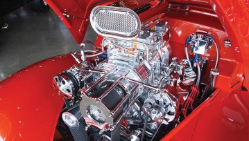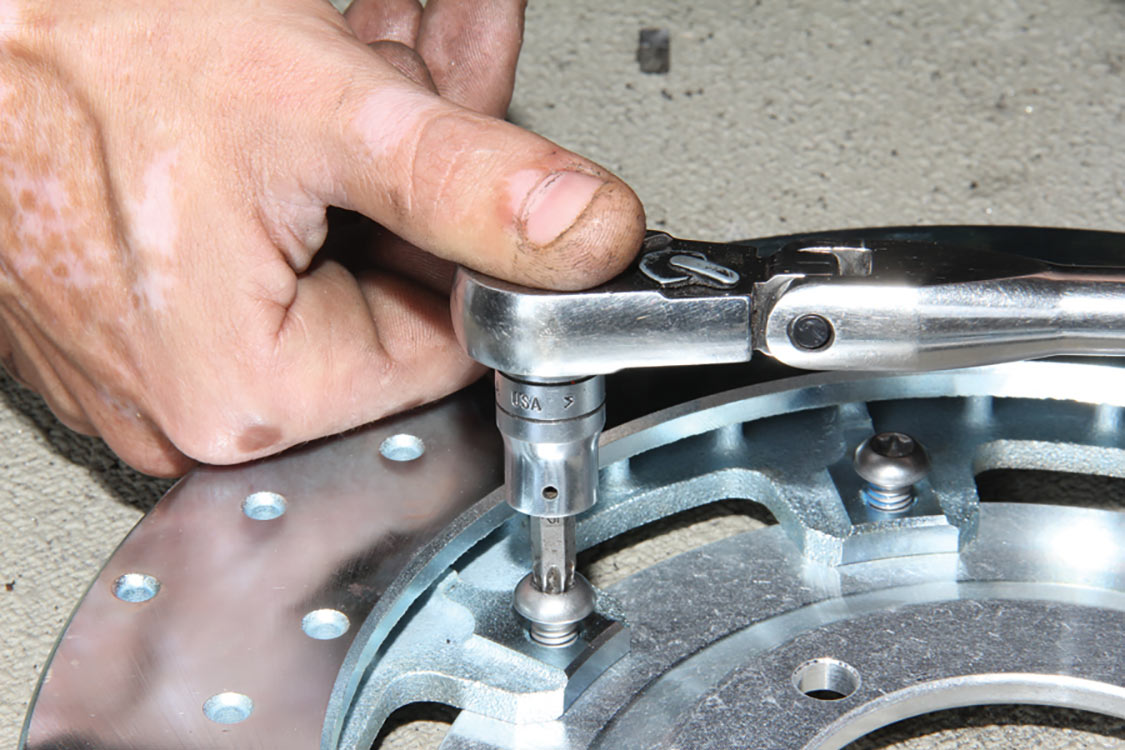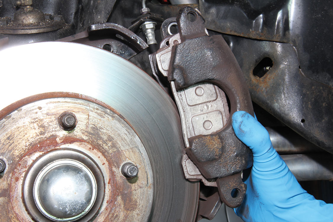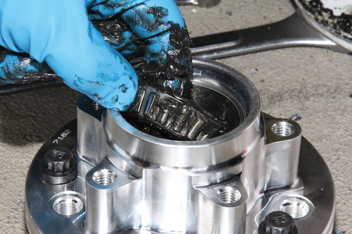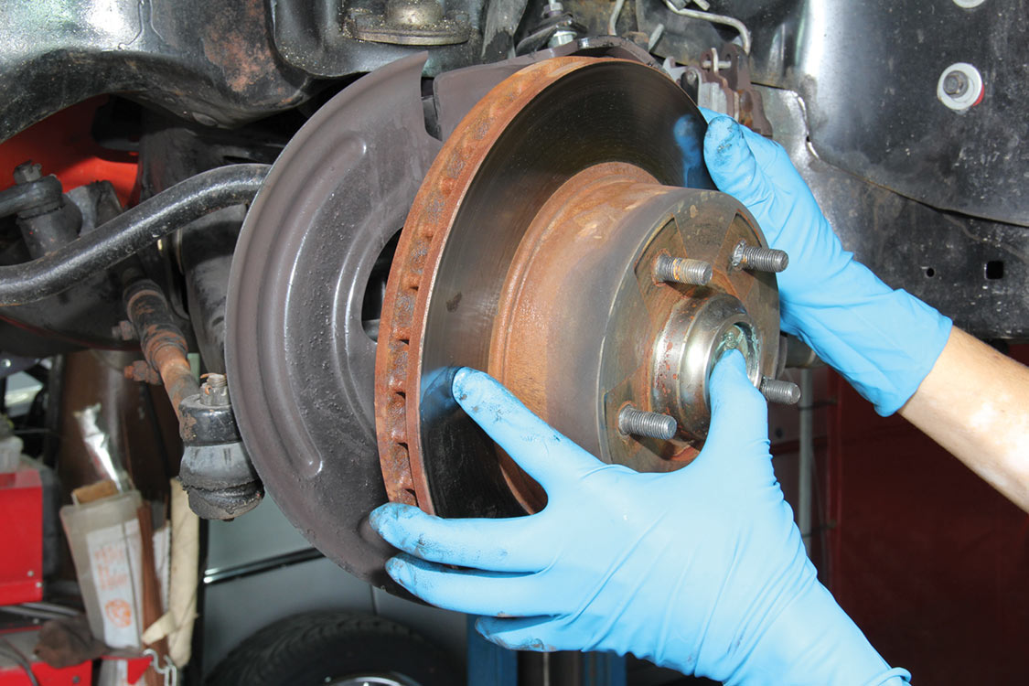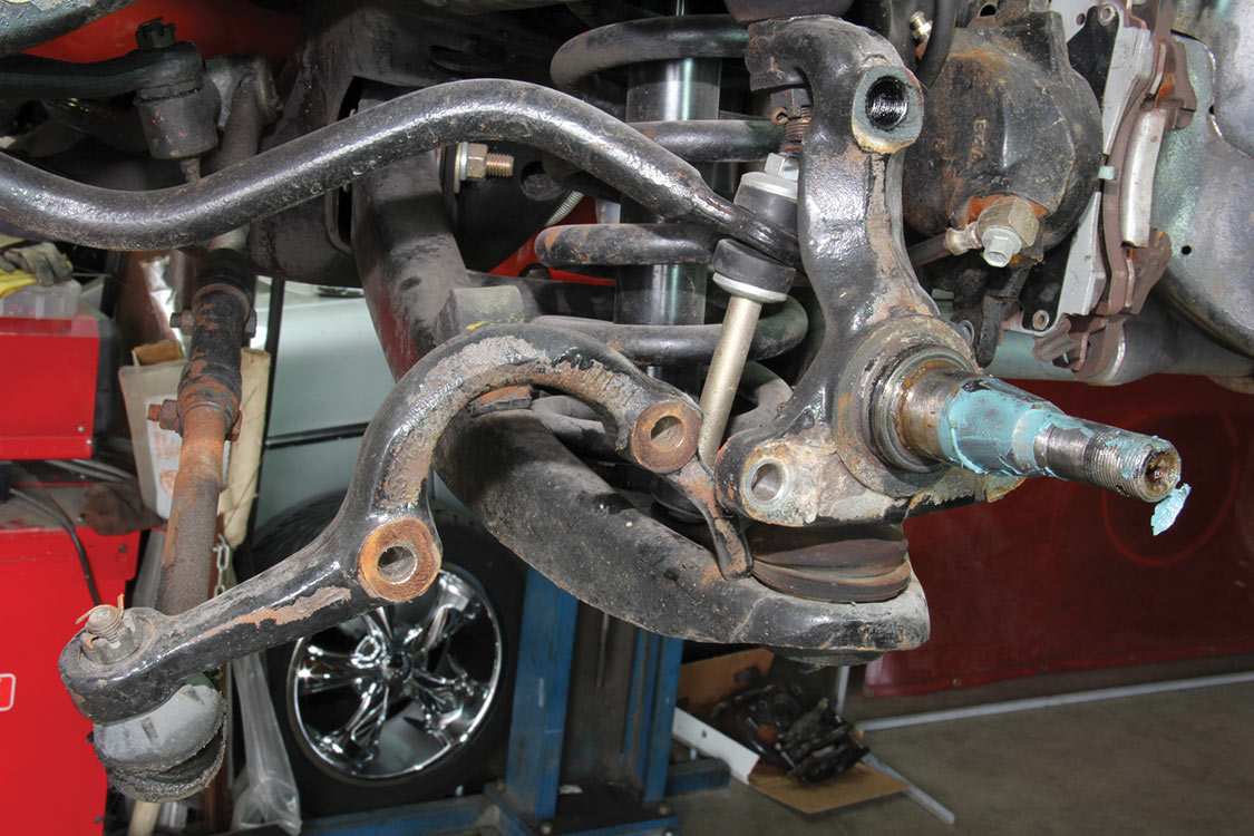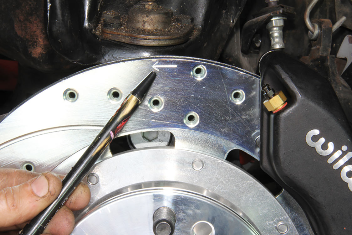 The factory front tie rod/steering arm was unbolted from the spindle/steering knuckle in preparation for the new Wilwood brake components.After mounting the Wilwood front brake caliper, the mounting bracket was torqued to 140 ft-lbs.The front tie rod/steering arm was remounted and torqued to spec.Packing the inner and outer hub bearings with grease is always a messy job. The Wilwood brake kit came with Timken (40494S) hub/rotor inner and outer cone bearings. Edgar applied Loctite Red thread locker to each of the five 12-point head wheel studs and threaded them into the proper 4.75-lug pattern of the hub. Next, he torqued them to 77 ft-lbs.After applying Loctite Blue thread locker to the bolt threads, Edgar inserted and threaded them into the adapter rotor or hat and torqued them using an alternating sequence to 25 ft-lbs to mount them to the rotor.Here is the Wilwood adapter rotor hat secured to the 12.19-inch diameter iron cross-drilled and ball-milled rotor. The hub assembly is shown in the foreground.The hub assembly was secured to the adapter rotor hat using Loctite Blue thread locker on Torx head bolts. An alternating torque sequence was used as the Torx head bolts to 55 ft-lbs.The Wilwood brake rotor, adapter rotor hat and hub were aligned and slid over the factory spindle. The outer Timken hub/rotor outer cone bearings were centered on the spindle.After the spindle washer was slid onto the spindle, the castle nut was threaded snugly onto the spindle threads. Edgar rotated the rotor assembly to acquire the proper rotational load/drag, eliminating any lateral play. Then he aligned the castle nut and inserted the safety cotter pin into the spindle hole and castle nut before bending it over the spindle. The Wilwood dust cap with O-ring was aligned and fit to the hub/rotor assembly.Supplied alignment shims were used to center the brake rotor to the brake caliper. The same amount of alignment shims (two) were used on the top and bottom. This contributes to even brake pad wear.After the Wilwood four-piston caliper and rotor were aligned and centered, the caliper mounting bolts were torqued to 40 ft-lbs.The Wilwood (BP-10) semi-metallic brake pads were inserted between the caliper pistons and rotor.The Wilwood brake pads’ safety cotter pin was inserted into the caliper brake pads to secure the holes.All Wilwood cross-drilled, ball-milled rotors have a stamped direction arrow to ensure the rotors are installed on the correct side of the vehicle. The arrow must be pointing in the forward rotation of the wheel/tire. The driver’s side should be rotating counter-clockwise, while the passenger side should rotate clockwise.The rotor was spun one more time to make sure there was proper clearance and rotation load.While installing the Wilwood brakes we decided to also install new stainless steel braided brake lines. This will eliminate any brake line swelling, chaffing or cracking.