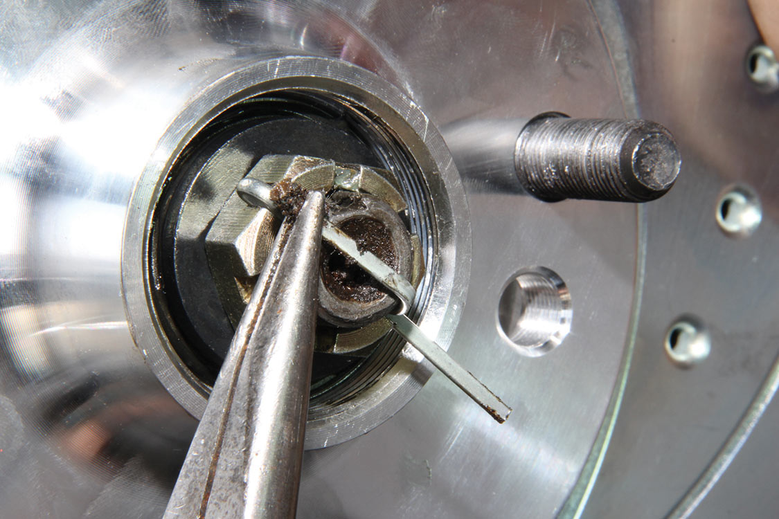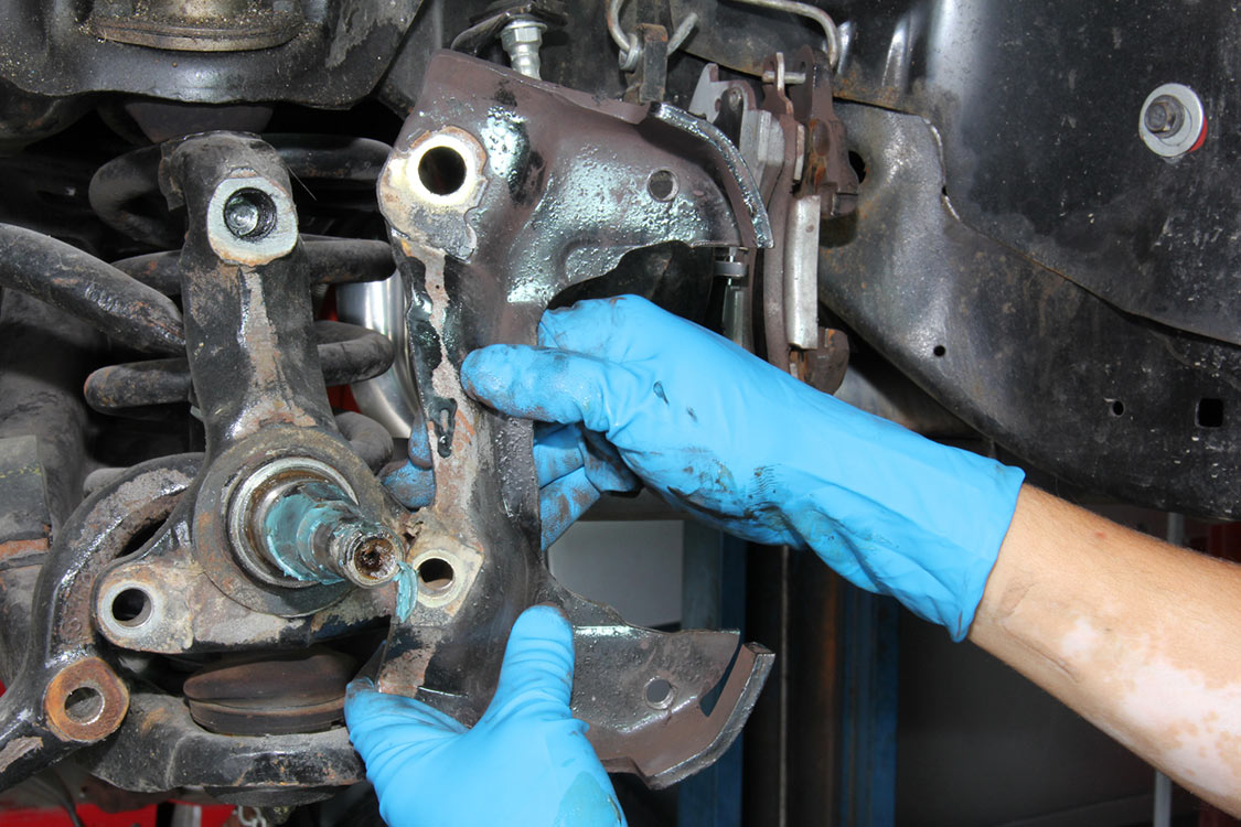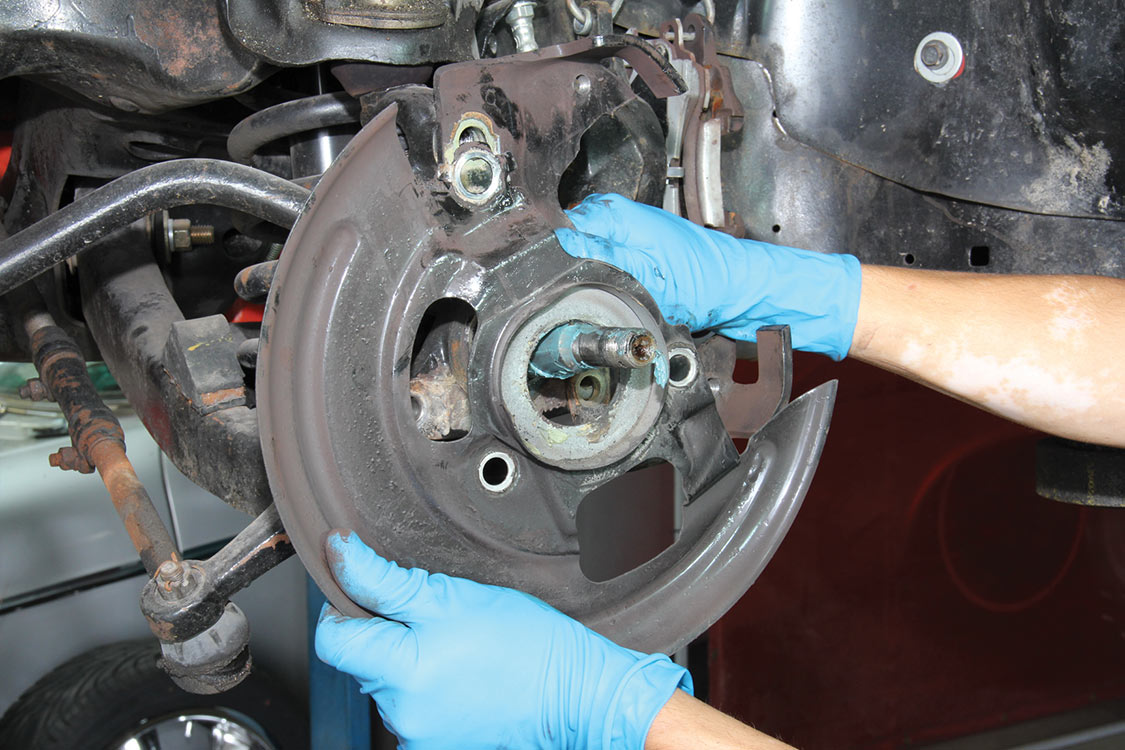 After racking the ’71 Chevelle, Edgar removed the wheel and combo tire from the factory front disc brake hub and rotor assembly.The factory disc brake caliper and pads were removed from the mounting bracket, backing plate and hub and rotor assembly.