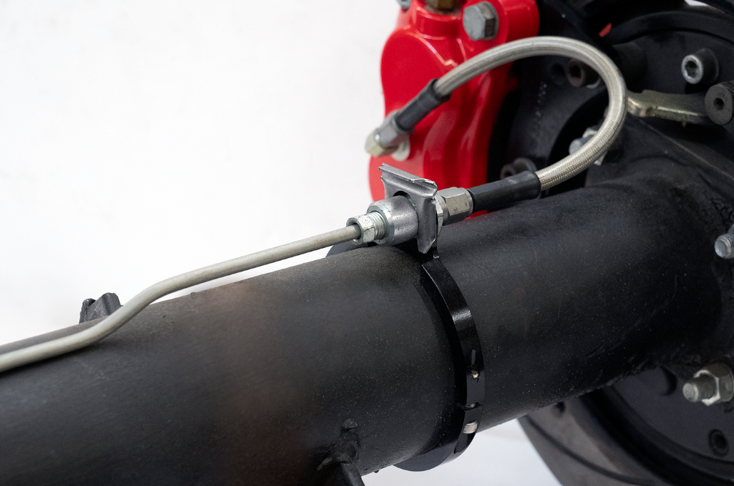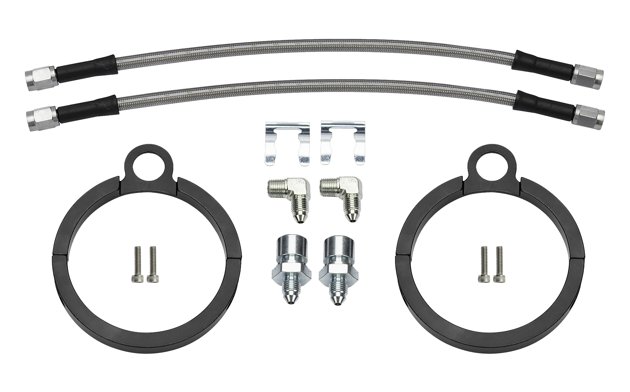 Wilwood has engineered a solution to simplify the secure mounting of Flexline hoses to 3.00” solid axle rear ends. Our 3” Axle Clamps will assist the installer by including all necessary parts to attach calipers with Flexlines to the chassis hardlines. The kit includes 3.00” axle clamp-on brackets with line mounts to hold the 12” Flexline to-caliper connection to a 3/16” chassis hardline. Choose either 45° or 90°, -3 to 1/8-27 NPT fittings at the caliper end, and mount the -3 to 3/8-24 IF through the mount on the axle clamp and hold in place using the provided chassis retainer clips.