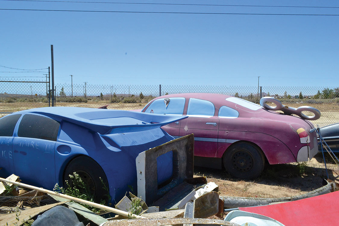 From there, we moved into the back desert lot where we saw a few dusty vehicles that were purpose-built to fit specific film roles, such as the flying police car from Back to the Future Part II, and a “wind-up” life sized toy car, used in a motor oil commercial. Also, waiting to be restored was a “Mirage”, a Cadillac luxury pickup conversion. Gene explained that in the mid ‘70s, he ran a shop called Traditional Coach Works Ltd of Chatsworth, CA that built and sold 96 Cadillac station wagons and 120 pickups, all built to Cadillac’s high standards and sold through Cadillac dealerships. In fact, Evil Knievel owned two, and one shows up the movie Viva Knievel. Gene recently managed to round up one survivor, and soon plans to restore it to its former glory. Several other remnants of cars sunbathe in the Mojave desert sand as they await future customization.