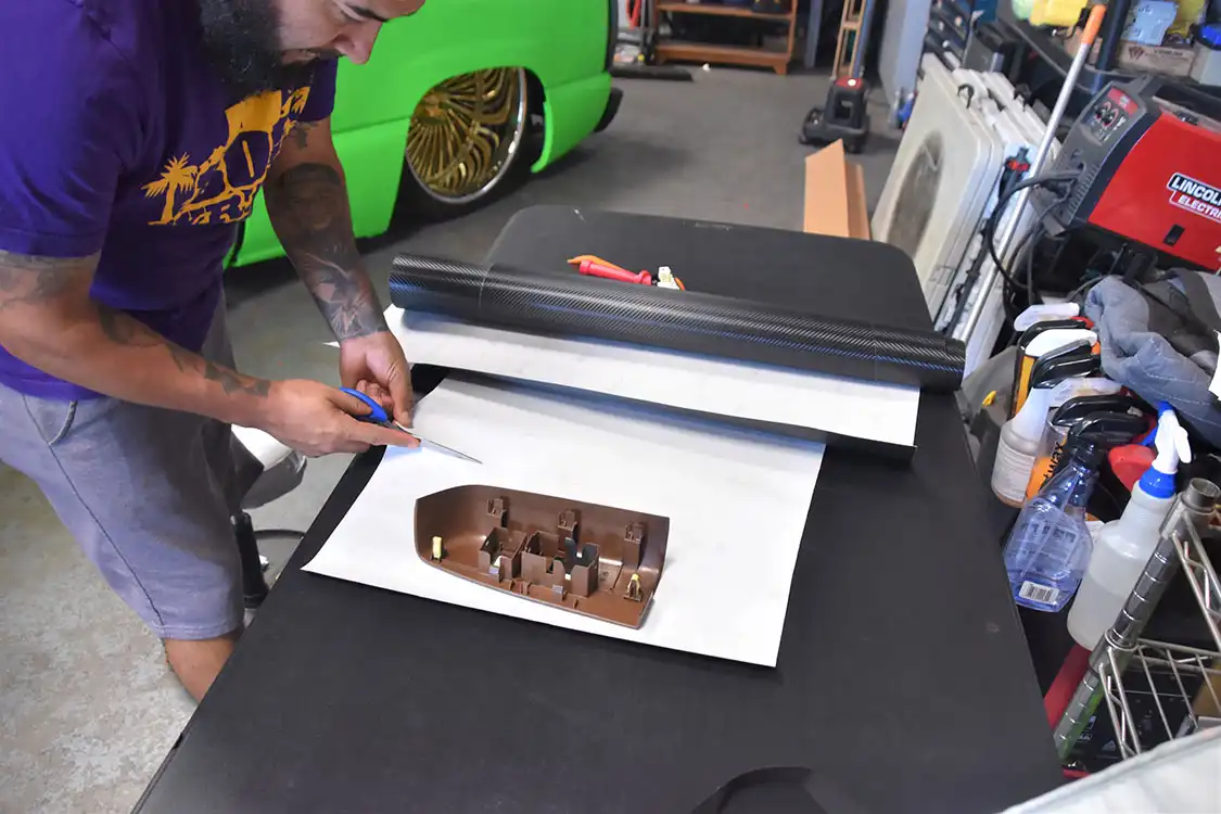 Once the armrest was wrapped, Miguel used an X-acto knife to carefully trim all the excess material and cut out the areas where the window and door lock switches would be. A quick once-over with a heat gun and the former boring, fake wood trim armrest was now a bitchin’ looking carbon fiber finish piece.
