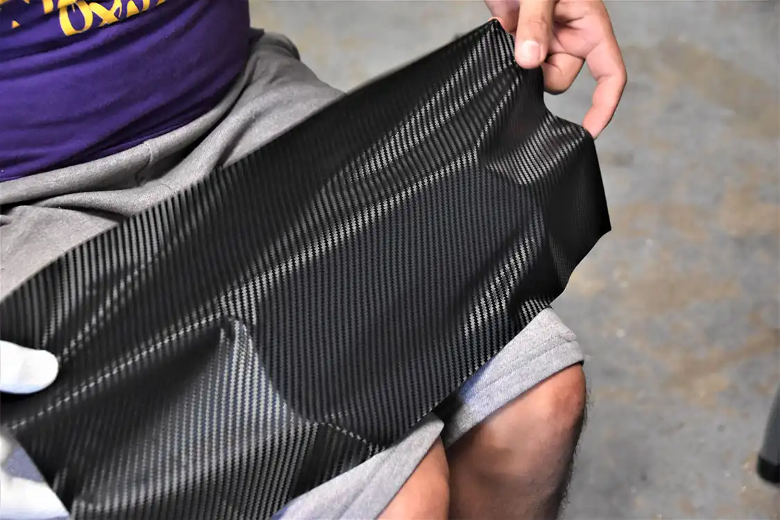 With so many choices it was difficult to choose but when Miguel showed us a carbon fiber-style wrap we thought it would look perfect on all the door panels of the Tundra. Sweet! Let’s do it!