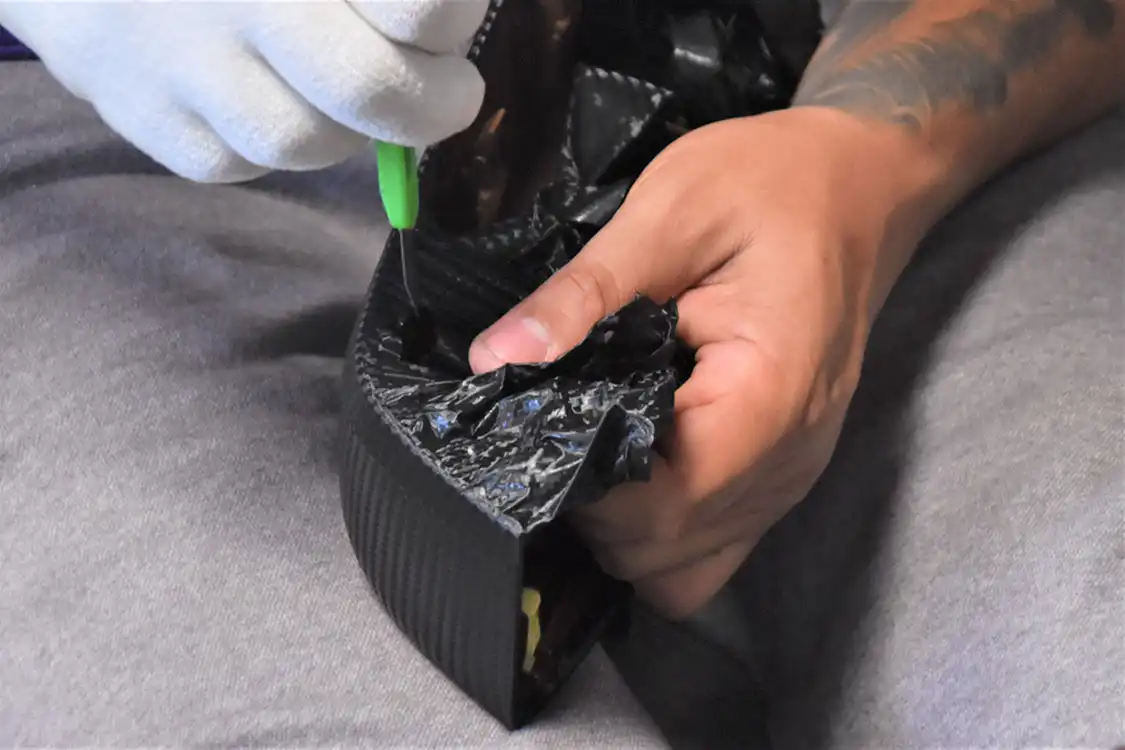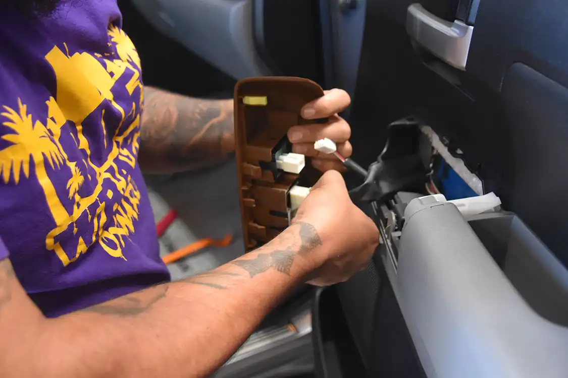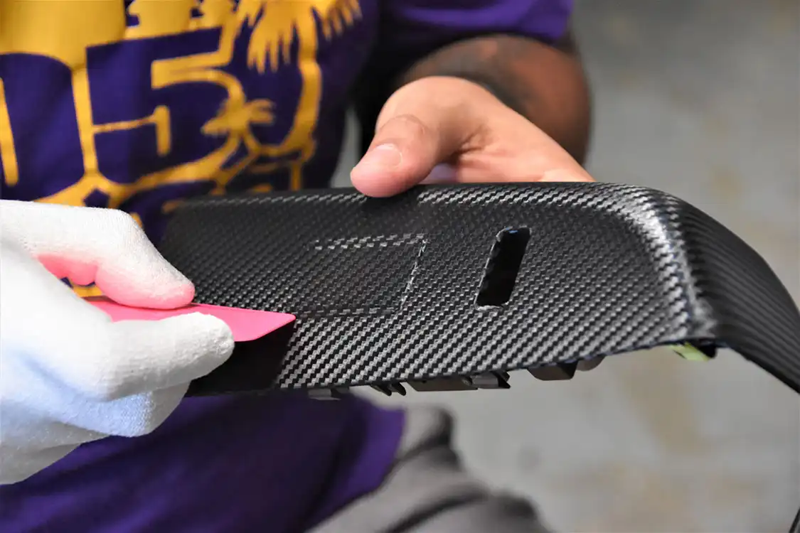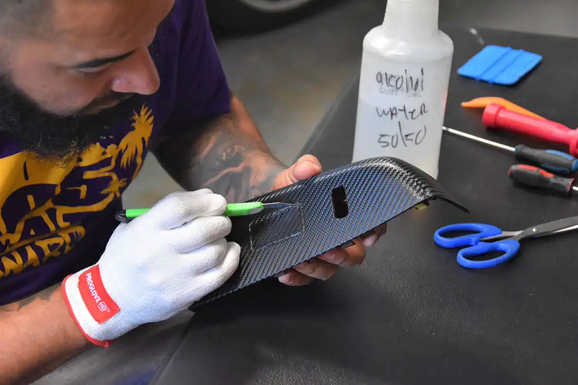 Once the surfaces were clean it was time to fit the carbon fiber wrap. The first thing was to stretch the fabric over the armrest and basically start molding it around all the curves and the areas where the switches would go. With a little help from a heat gun the fabric bonded tight to the armrest. This is where experience and technique come into play. Knowing how much to stretch the wrap and how much heat is applied to the certain areas that you are working on so there isn’t too much distortion to the vinyl and you achieve good adhesion. Miguel made it look easy.