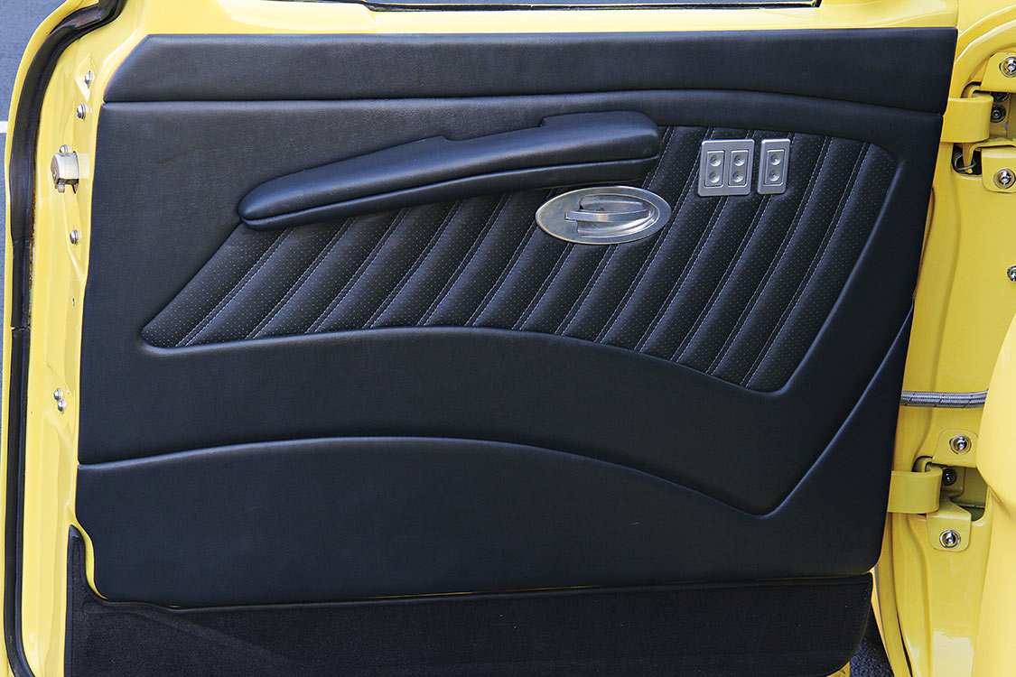 Inside, the factory gauges and speed cluster were removed, filled in and smoothed. The original owner installed Autometer white face gauges, and water temp, fuel level, tachometer, speedometer, oil pressure and volt gauges were neatly inserted were the factory cluster used to reside. Keeping the audio simple, the crew at Ultimate Car Toys of Dublin installed a Ford six-CD head unit with iPod adapter into the dash. The sound was amplified by an Alpine unit that powers two tweeters in the dash and two 6-inch speakers stuffed in the kick panels; a pair of 8-inch subwoofers was mounted behind the bucket seats. A Vintage Air system with vents was mounted into the dash, and an Ididit chrome tilt steering column was capped with a Budnik Shock split grip black leather four-spoke black powder-coated billet aluminum steering wheel. The custom interior was created by the team at Finish Line Interiors from San Jose, California. A layer of Dyamat was installed before laying down the black carpet. A pair of 2008 Chevy Tahoe bucket seats was covered in dark charcoal leather and separated by a custom storage center console.