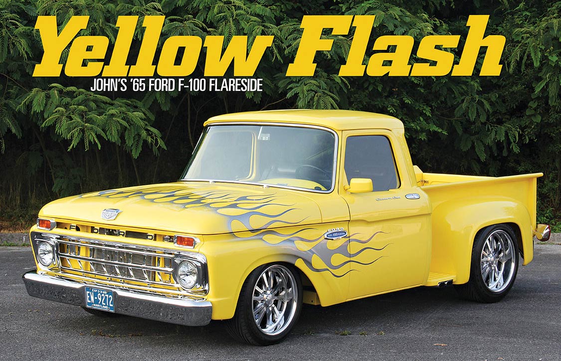 John and his wife Karen were celebrating their twenty-sxith wedding anniversary while attending the Barrett-Jackson auction in Palm Beach, Florida, where they noticed an eye-catching Yellow Flash ’65 Ford F-100 Flareside pickup highlighted with silver pearl flames. Karen fell in love with the truck, and like all good husbands, John exchanged a stack of greenbacks for the pink slip from the previous owner/builder Glen Van Buskirk from Castro Valley, California. After driving the ’65 for about six months, John decided to personalize the truck to his taste. He and his friend Tim Davis began the journey together.